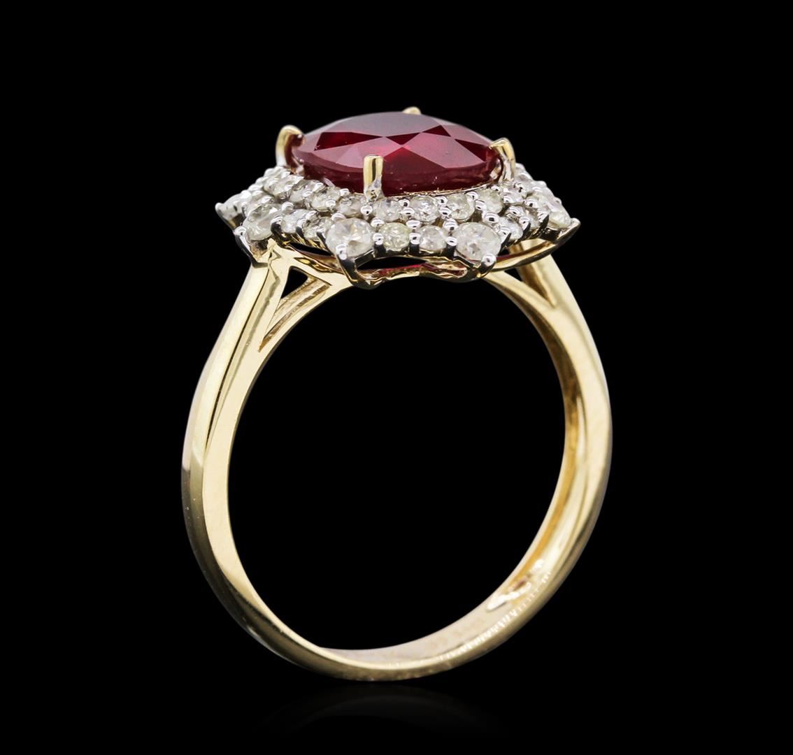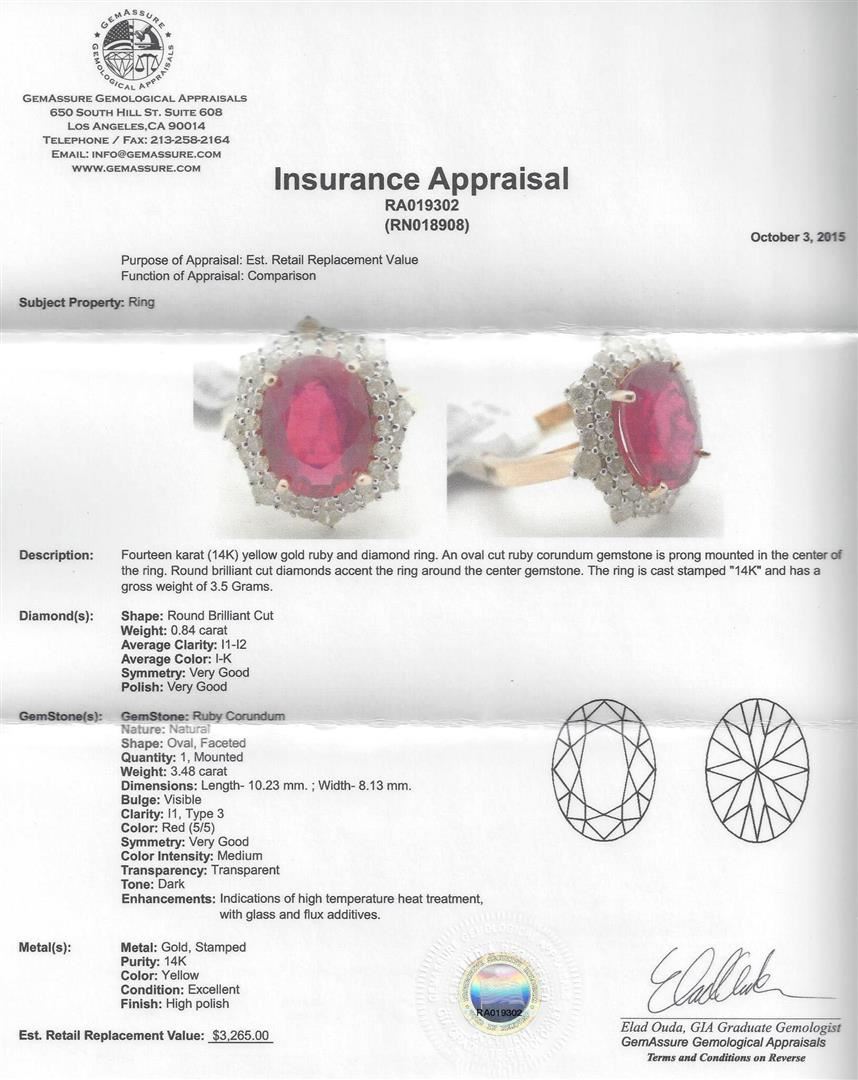 Fourteen karat (14K) yellow gold ruby and diamond ring. An oval cut ruby corundum gemstone is prong mounted in the center of the ring. Round brilliant cut diamonds accent the ring around the center gemstone. The ring is cast stamped "14K" and has a gross GGA Appraised.