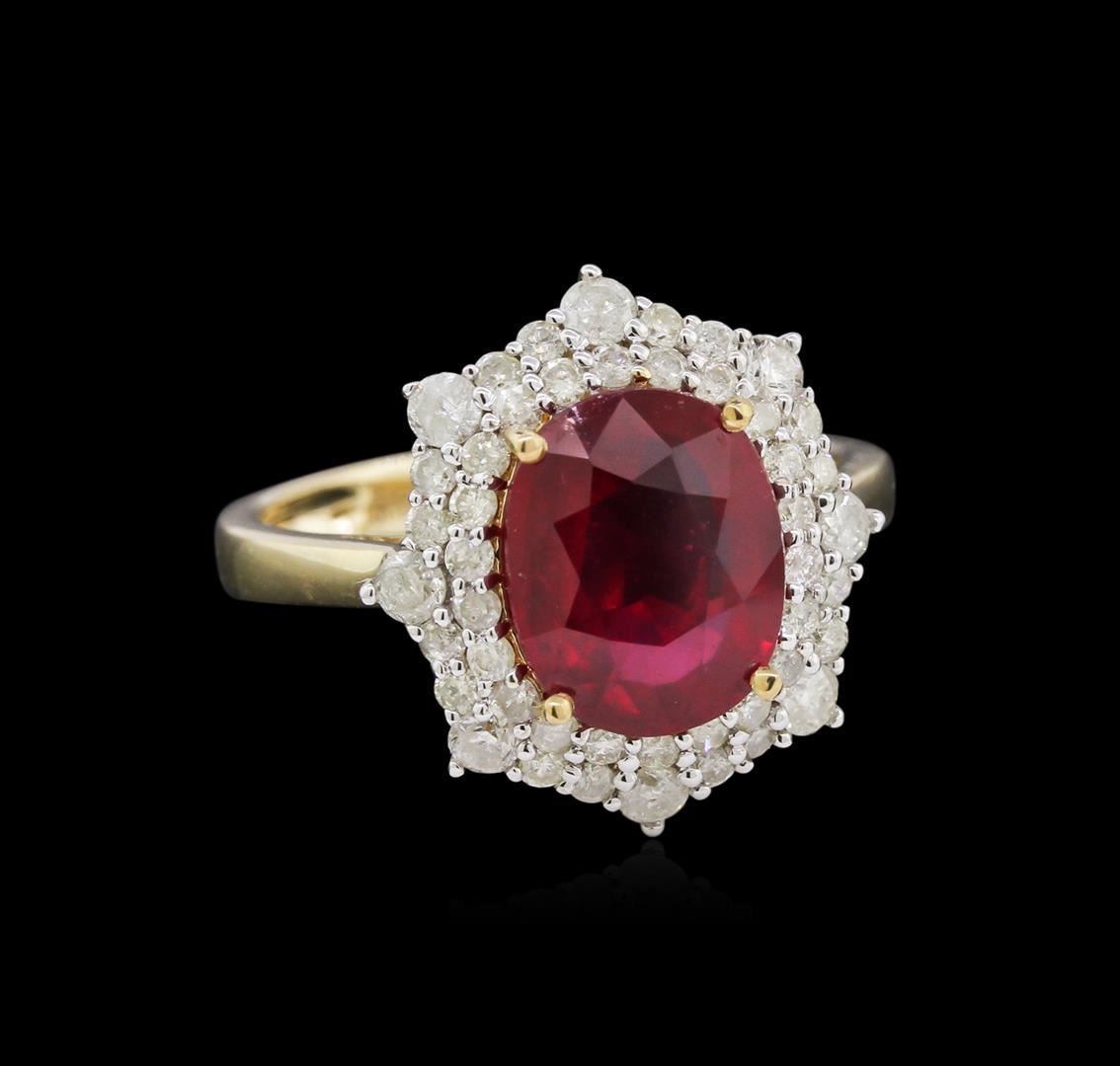 Fourteen karat (14K) yellow gold ruby and diamond ring. An oval cut ruby corundum gemstone is prong mounted in the center of the ring. Round brilliant cut diamonds accent the ring around the center gemstone. The ring is cast stamped "14K" and has a gross weight of 3.5 Grams. Diamond(s): Shape: Round Brilliant Cut. Weight: 0.84 carat. Average Clarity: I1-I2. Average Color: I-K. Symmetry: Very Good. Polish: Very Good. Gemstone(s): GemStone: Ruby Corundum. Nature: Natural. Shape: Oval, Faceted. Quantity: 1, Mounted. Weight 3.48 carat. Dimensions: Length-10.23 mm. ; Width- 8.13 mm. Bulge: Visible. Clarity: I1, Type 3. Color: Red (5/5). Symmetry: Very Good. Color Intensity: Medium. Transparency: Transparent. Tone: Dark. Enhancements: Indications of high temperature heat treatment, with glass and flux additives. Metal(s): Metal: Gold, Stamped. Purity: 14K. Color: Yellow. Condition: Excellent. Finish: High polish. GGA Appraised.