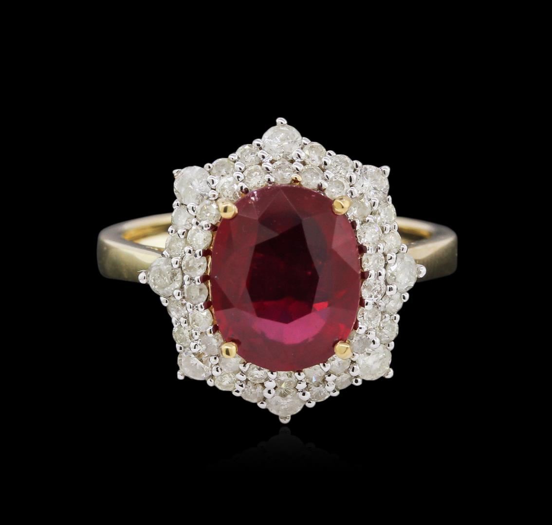 Fourteen karat (14K) yellow gold ruby and diamond ring. An oval cut ruby corundum gemstone is prong mounted in the center of the ring. Round brilliant cut diamonds accent the ring around the center gemstone. The ring is cast stamped "14K" and has a gross weight of 3.5 Grams. Diamond(s): Shape: Round Brilliant Cut. Weight: 0.84 carat. Average Clarity: I1-I2. Average Color: I-K. Symmetry: Very Good. Polish: Very Good. Gemstone(s): GemStone: Ruby Corundum. Nature: Natural. Shape: Oval, Faceted. Quantity: 1, Mounted. Weight 3.48 carat. Dimensions: Length-10.23 mm. ; Width- 8.13 mm. Bulge: Visible. Clarity: I1, Type 3. Color: Red (5/5). Symmetry: Very Good. Color Intensity: Medium. Transparency: Transparent. Tone: Dark. Enhancements: Indications of high temperature heat treatment, with glass and flux additives. Metal(s): Metal: Gold, Stamped. Purity: 14K. Color: Yellow. Condition: Excellent. Finish: High polish. GGA Appraised.
