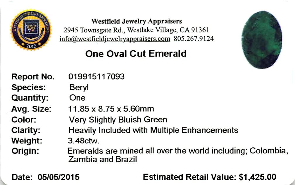 One oval mixed cut natural emerald, measuring 11.85 x 8.75 x 5.60mm, exact weight 3.48ct., clarity is heavily included, medium dark, very slightly grayish, very slightly bluish green color, (GIA vslbG 6/3) Indications of multiple laboratory enhancements, including high temperature heat treatment Westfield Appraised at $1,410.00.
