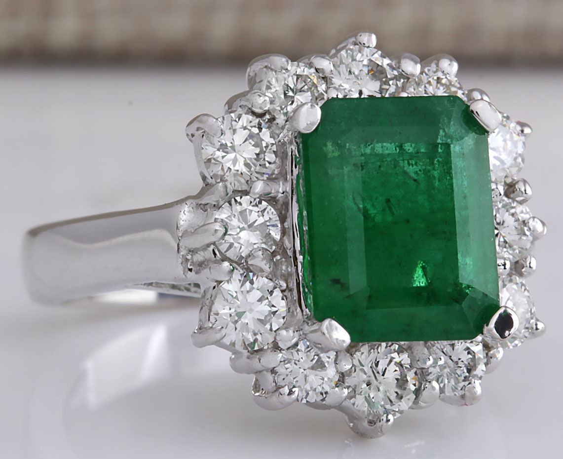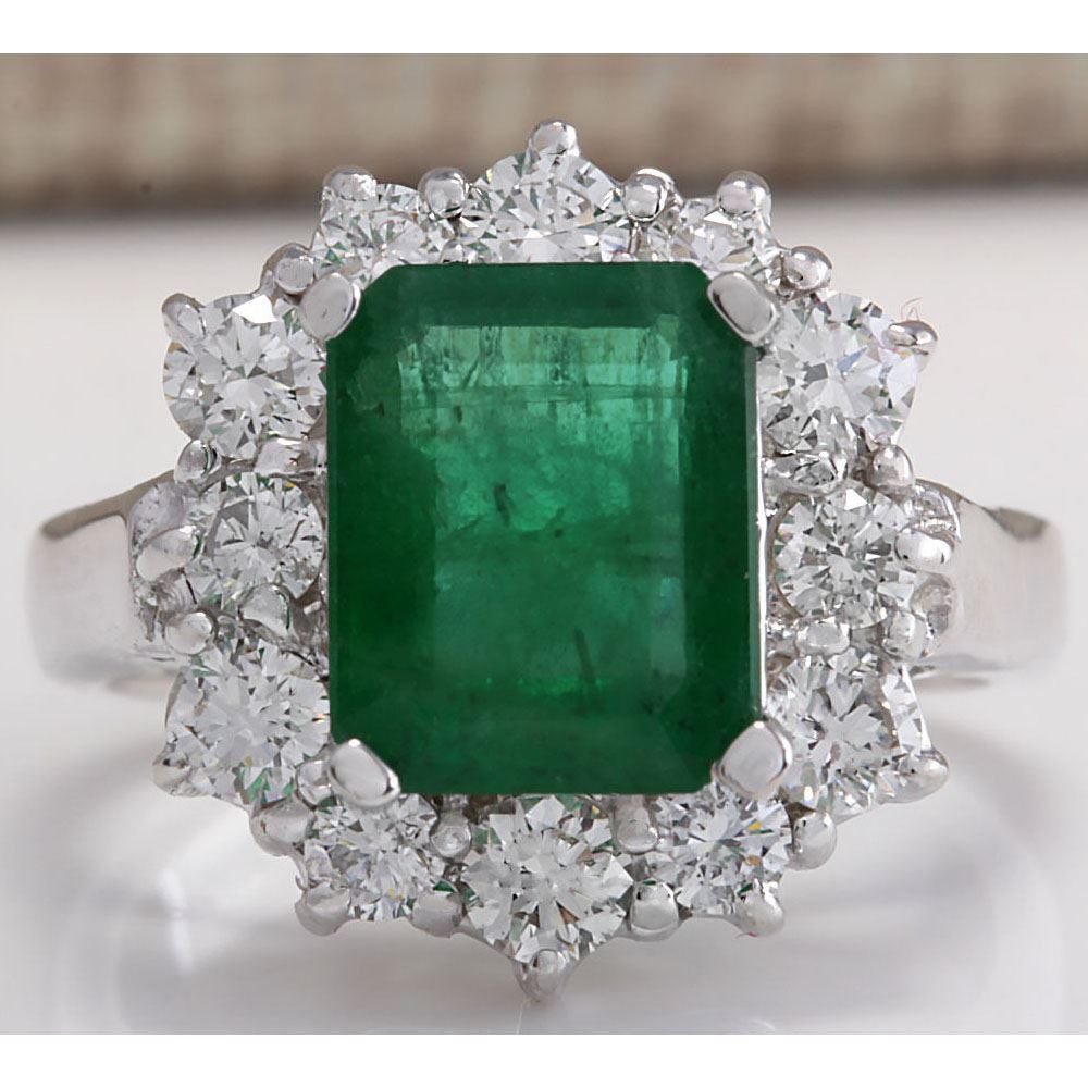3.49 CTW Natural Emerald And Diamond Ring 18K Solid White Gold