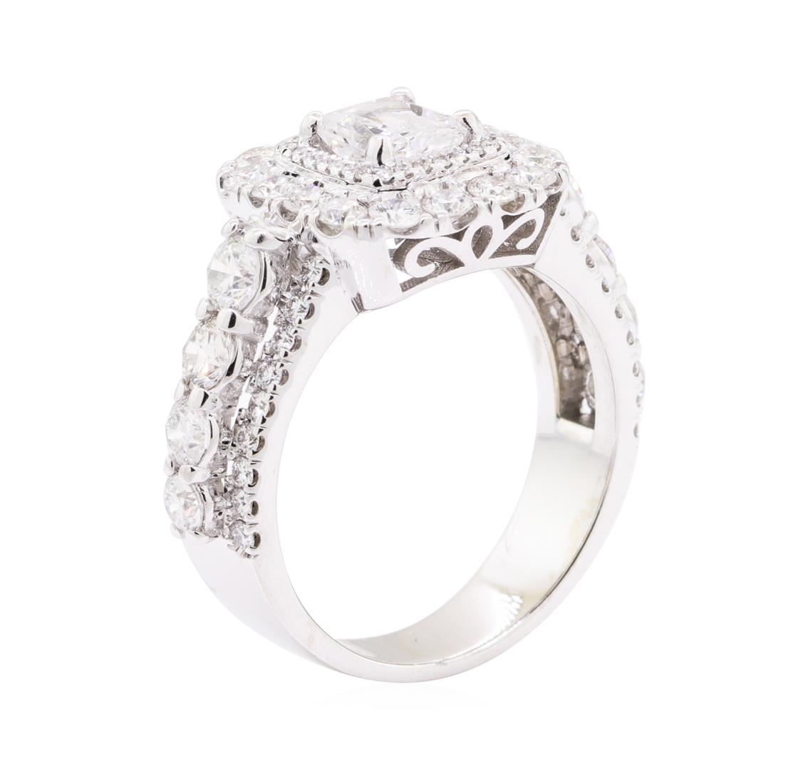 One electronically tested 14KT white gold lady's cast wedding ring with a double cushion halo with a bright polish finish. The featured lady's ring has a shank measuring 5.30 millimeters wide. Identified with markings of '14K'. Condition is new, good workmanship. Containing: One prong set cushion cut diamond, measuring 6.68 x 5.13 x 3.53mm (depth est.) approximate weight of 1.04ct. Girdle: Thin to Medium, PolishedCulet: NoneFluorescence: NoneGraded loose prior to setting in the EGLUS Laboratory, Report #US918465703. Color E Clarity I-2 Cut Very Good Eight prong set round brilliant cut diamonds, measuring 3.60 - 2.80 x 1.98mm (depth est.) approximate total weight of 8 Stones = 1.00ct. Graded in the setting. Color H - I Clarity SI-1 to SI-2 Cut Good Sixteen prong set round brilliant cut diamonds, measuring 2.40 - 2.30 x 1.46mm (depth est.) approximate total weight of 16 Stones = 0.80ct. Graded in the setting. Color H - I Clarity VS-2 to SI-1 Cut Very Good Thirty-Six prong set round brilliant cut diamonds, measuring 1.60 - 1.55 x 0.98mm (depth est.) approximate total weight of 36 Stones = 0.55ct. Graded in the setting. Color H - I Clarity VS-2 to SI-1 Cut Very Good Twenty-Eight prong set round brilliant cut diamonds, measuring 1.00 - 0.95 x 0.61mm (depth est.) approximate total weight of 28 Stones = 0.10ct. Graded in the setting. Color H - I Clarity SI-1 to SI-2 Cut Very Good. Total Weight of Diamonds 3.49ct.. Total Weight of Ring 10.10gm GAS Appraised at $10180.00. GAS Appraised at $10,180.00.