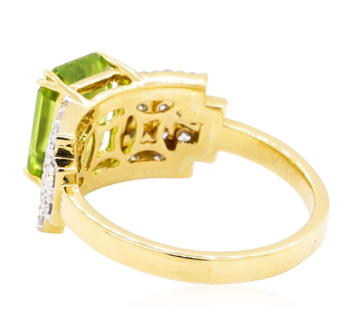 One electronically tested 18KT yellow gold lady's cast fashion ring with a four row wide band motif with a bright polish finish. The featured lady's ring has a shank measuring 2.25 millimeters wide. Identified with markings of '18K'. Condition is new, good workmanship. Containing: One prong set emerald modified step cut natural peridot, measuring 9.71 x 7.15 x 4.80mm, (depth est.) approximate weight of 2.83ct., clarity is eye clean, medium, moderately strong, strongly yellowish green color, (GIA styG 5/4), cut is very good. Transmitting light with no distortion, transparent. Colored gemstones are presumed to have been subjected to commonly used enhancement processes. Graded in the setting. Twenty-Eight prong set round brilliant cut diamonds, measuring 1.90 - 1.80 x 1.15mm (depth est.) approximate total weight of 28 Stones = 0.66ct. Graded in the setting. Color G - H Clarity VS-2 to SI-1 Cut Very Good. Total Weight of Colored Stones 2.83ct.. Total Weight of Diamonds 0.66ct.. Total Weight of Ring 4.70gm GAS Appraised at $4525.00. GAS Appraised.