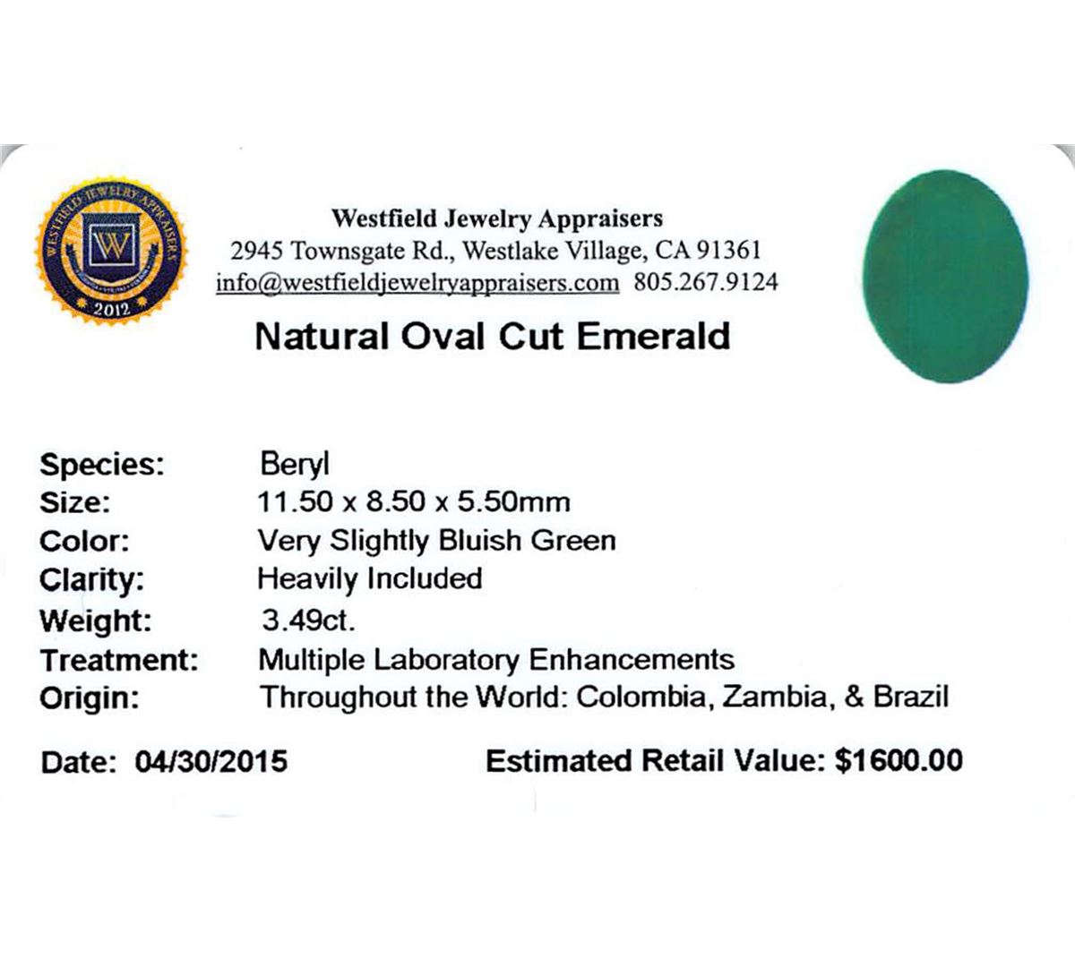 One oval mixed cut natural emerald exact weight 3.49ct., clarity is heavily included, type III, medium dark, very slightly grayish, very slightly bluish green color, (GIA vslbG 6/3), cut is good. Westfield Appraised at $1,600.00.