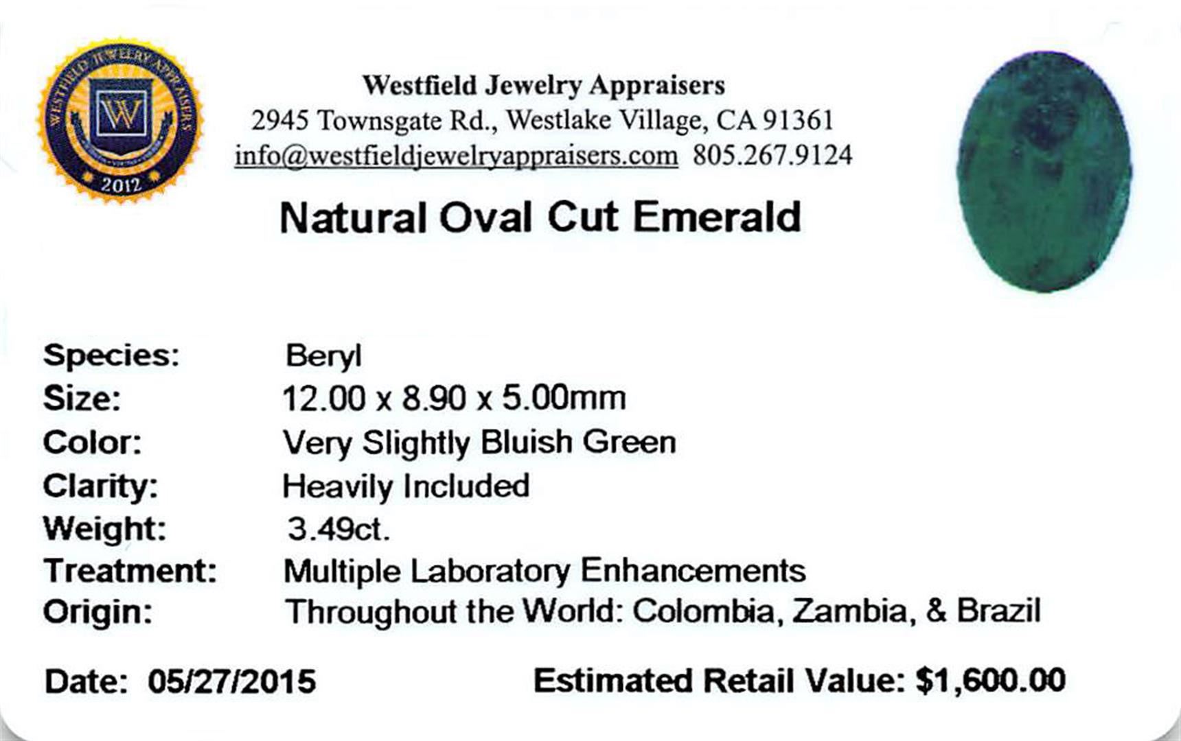 One oval mixed cut natural emerald, measuring 12.00 x 8.90 x 5.00mm, exact weight 3.49ct., clarity is heavily included, type III, medium dark, very slightly grayish, very slightly bluish green color, (GIA vslbG 6/3), cut is good. Transmitting light somewhat diffusely, translucent, Naturally occurring internal & external characteristics are present, Indications of multiple laboratory enhancements, including high temperature heat treatment. Westfield Appraised at $1,600.00.