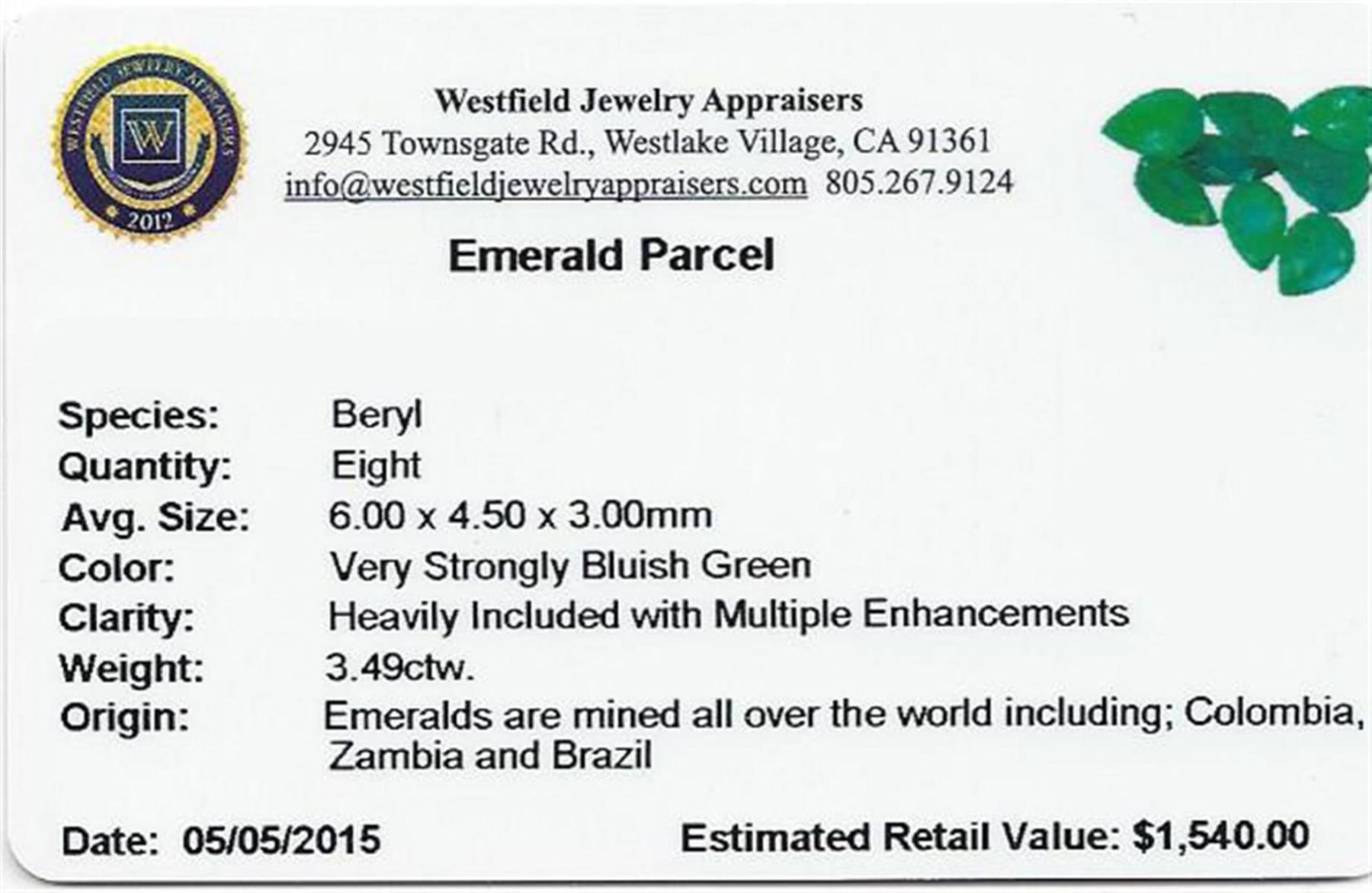 Eight pear mixed cut natural emeralds, measuring 6.00 x 4.50 x 3.00mm, exact total weight 3.49ct., clarity is heavily included, type III, medium dark, moderately strong, very strongly bluish green color, (GIA vstbG 6/4), cut is good. Indications of multiple laboratory enhancements, including high temperature heat treatment. Westfield Appraised.