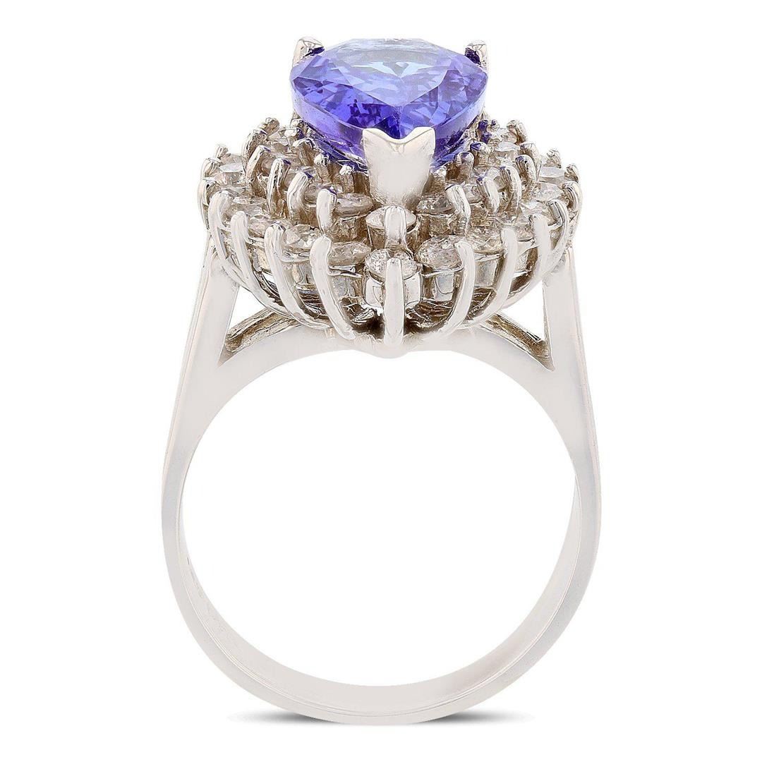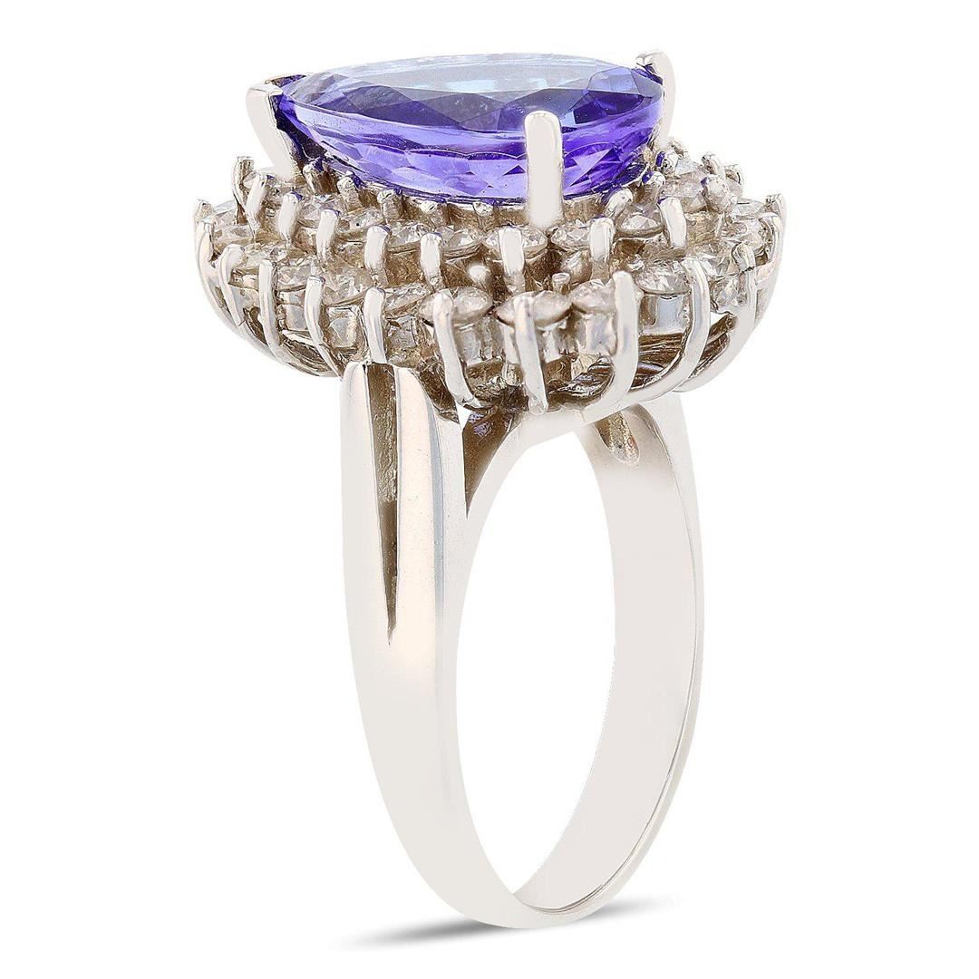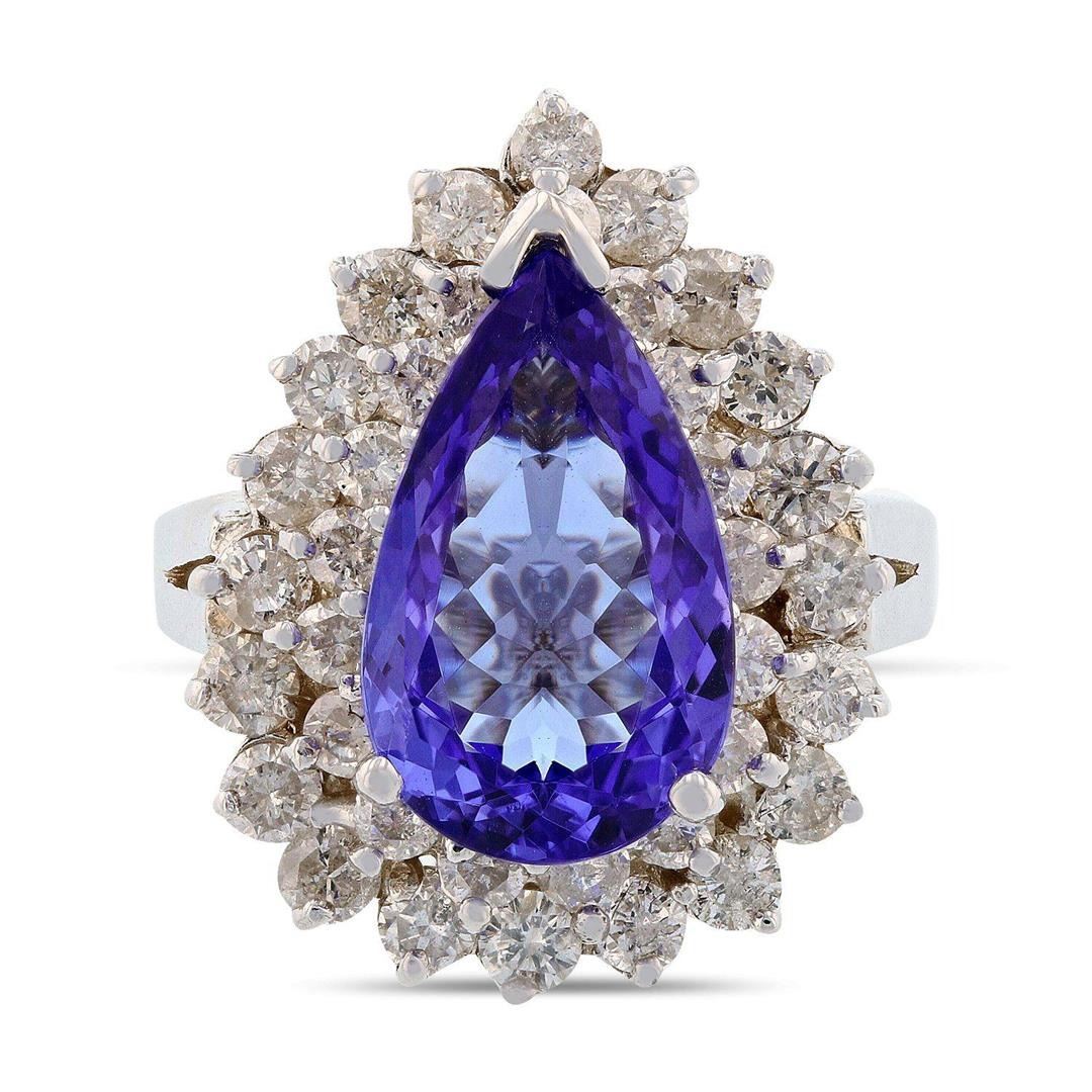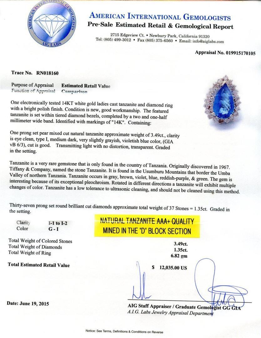 3.49ct Tanzanite and 1.35ctw Diamond 14K White Gold Ring. One electronically tested 14KT white gold ladies cast tanzanite and diamond ring with a bright polish finish. Condition is new, good workmanship. The featured tanzanite is set within tiered diamond bezels, completed by a two and one-half millimeter wide band. Identified with markings of "14K". Containing: One prong set pear mixed cut natural tanzanite approximate weight of 3.49ct., clarity is eye clean, type I, medium dark, very slightly grayish, violetish blue color, (GIA vB 6/3), cut is good. Transmitting light with no distortion, transparent. Graded in the setting. Tanzanite is a very rare gemstone that is only found in the country of Tanzania. Originally discovered in 1967. Tiffany & Company, named the stone Tanzanite. It is found in the Usumburu Mountains that border the Umba Valley of northern Tanzania. Tanzanite occurs in gray, brown, violet, blue, reddish-purple, & green. The gem is interesting because of its exceptional pleochroism. Rotated in different directions a tanzanite will exhibit multiple changes of color. Tanzanite has a low tolerance to ultrasonic cleaning, and should not be cleaned using this method. Thirty-seven prong set round brilliant cut diamonds approximate total weight of 37 Stones = 1.35ct. Graded in the setting. Clarity I-1 to I-2 Color G - I Total Weight of Colored Stones 3.49ct Total Weight of Diamonds 1.35ct Total Weight of Ring 6.82 gm