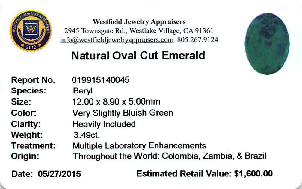 One oval mixed cut natural emerald, measuring 12.00 x 8.90 x 5.00mm, exact weight 3.49ct., clarity is heavily included, type III, medium dark, very slightly grayish, very slightly bluish green color, (GIA vslbG 6/3), cut is good. Transmitting light somewhat diffusely, translucent, Naturally occurring internal & external characteristics are present, Indications of multiple laboratory enhancements, including high temperature heat treatment. Westfield Appraised at $1,600.00.