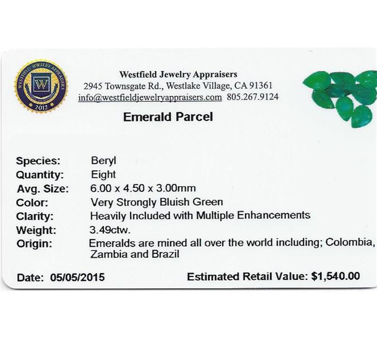 Eight pear mixed cut natural emeralds, measuring 6.00 x 4.50 x 3.00mm, exact total weight 3.49ct., clarity is heavily included, type III, medium dark, moderately strong, very strongly bluish green color, (GIA vstbG 6/4), cut is good. Indications of multiple laboratory enhancements, including high temperature heat treatment. Westfield Appraised at $1,540.00.
