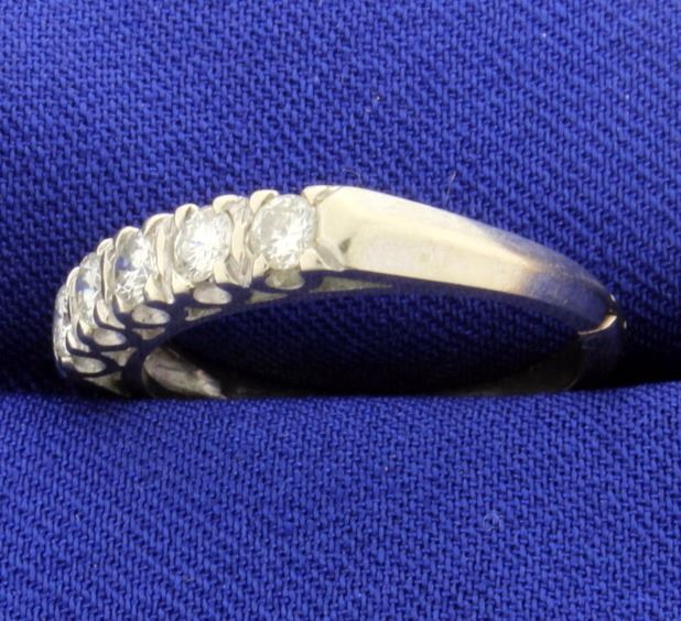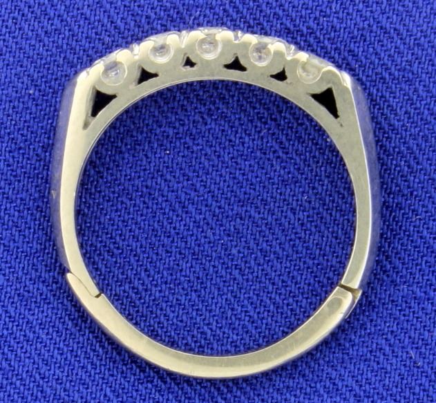 14K white gold, shank has hinge so it can be opened to put on for people with arthritis or large knuckles. There are five .15ct diamonds- VS clarity, I color. Size 7 2.8g