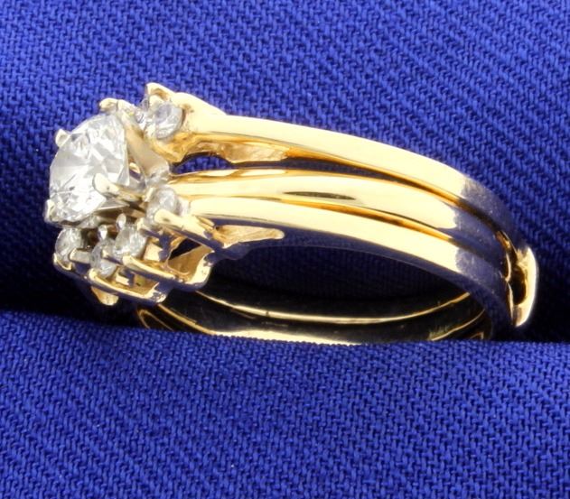 In 14K yellow gold, the center diamond is a high quality 1/2ct round SI3 clarity/G color and excellent cut. Surrounded by eight .03ct diamonds with same grade. Jacket is attached to engagement ring. Size 6 5.3g