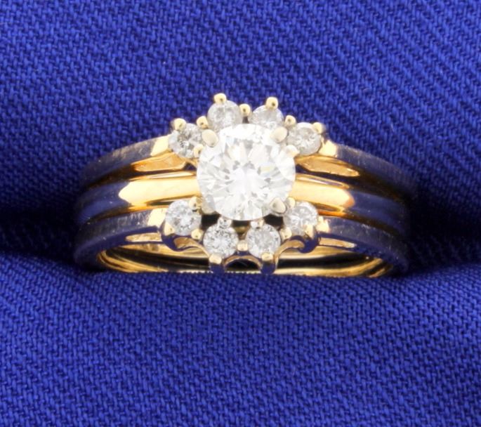 In 14K yellow gold, the center diamond is a high quality 1/2ct round SI3 clarity/G color and excellent cut. Surrounded by eight .03ct diamonds with same grade. Jacket is attached to engagement ring. Size 6 5.3g