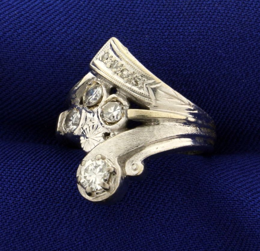 In 14k white gold, containing one 1/4ct, three 0.15ct, and four 0.01ct diamonds. All have a very high quality with SI clarity/H color. Size 5 1/2. 8.2g.