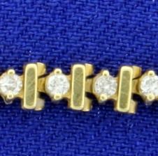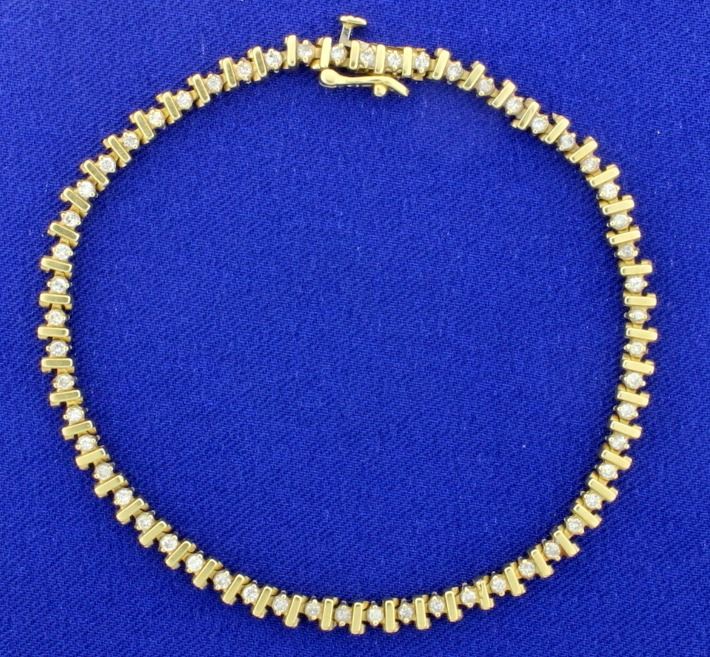 This bracelet is 14K yellow gold and is 7 1/2 inches long. It contains 3/4ct total weight of diamonds and has a safety clasp. 9.2g