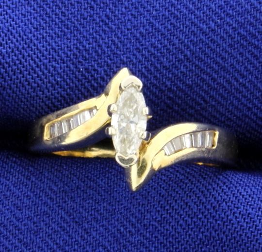 In 14K yellow gold, this ring contains a 1/2ct marquise diamond that is SI clarity/I color & is surrounded by 1/4ct total weight of baguette diamonds. Size 6 3.4g