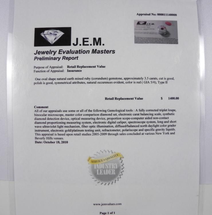 Gem Type: RubyQTY: 1Total Ct. Weight: 3.5Certification: Report from Jewelry Evaluation Masters