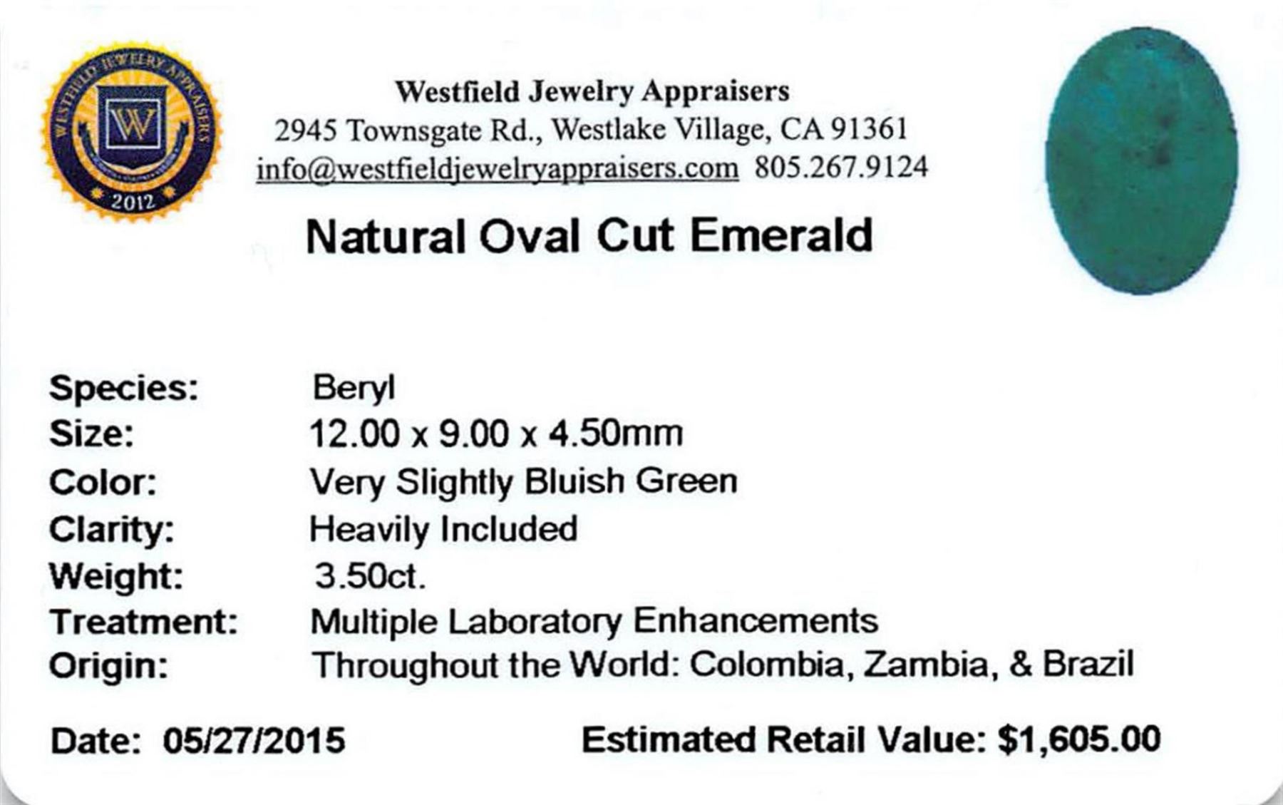 One oval mixed cut natural emerald, measuring 12.00 x 9.00 x 4.50mm, exact weight 3.50ct., clarity is heavily included, medium dark, very slightly grayish, very slightly bluish green color, (GIA vslbG 6/3), cut is good. Transmitting light somewhat diffusely, translucent, Naturally occurring internal & external characteristics are present, Indications of multiple laboratory enhancements, including high temperature heat treatment. Westfield Appraised at $1,605.00.