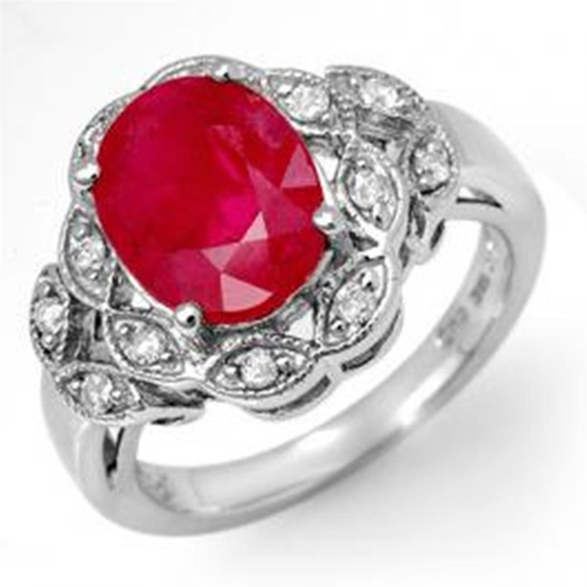 Diamond: 12 Round cut @ 0.25 ctw Clarity: SI-I Color: H-K Gemstone: Natural Ruby Gemstone color: RedGemstone quality: Good-to-Very Good Gemstone Cut & Weight: 1 Oval cut @ 3.25 ctw Metal Purity & Color : 10K Gold-White Gold weight: 5.30 grams Ring size (US): 6.5Dimension: Approx. 1/2" x 5/8"