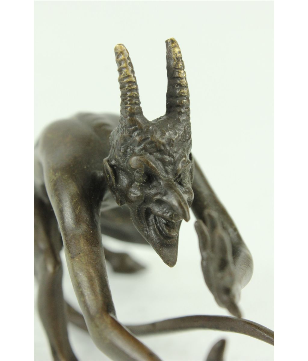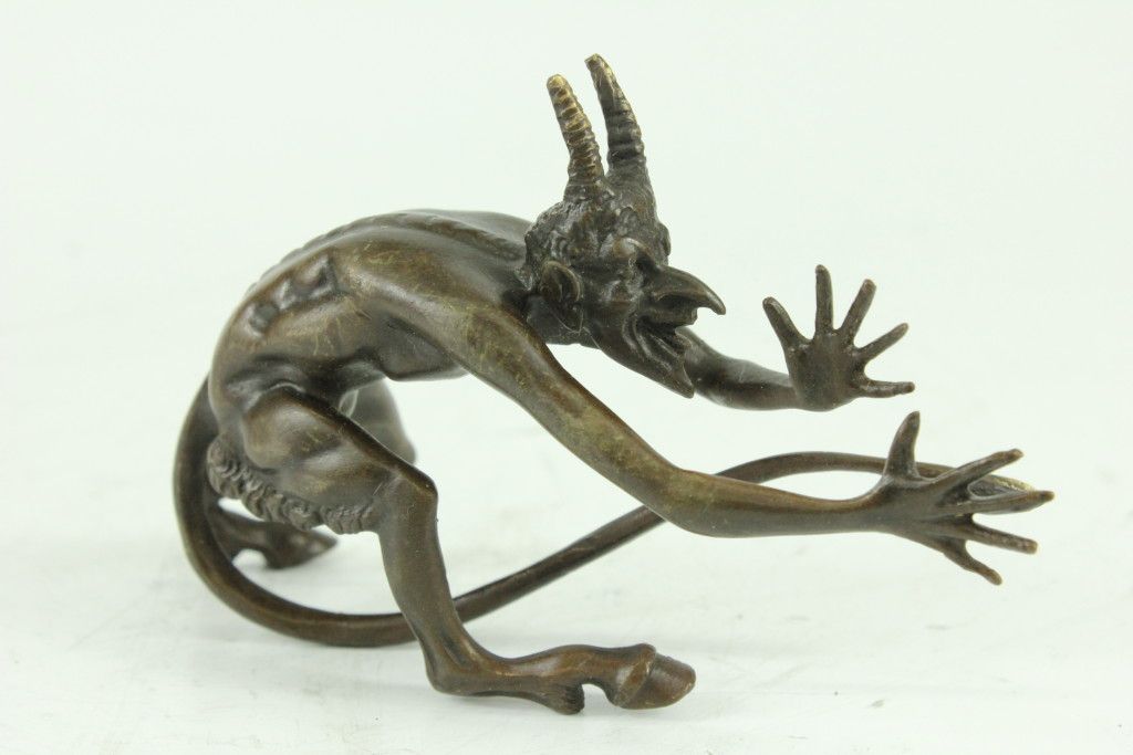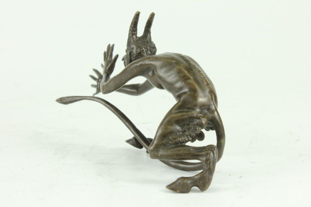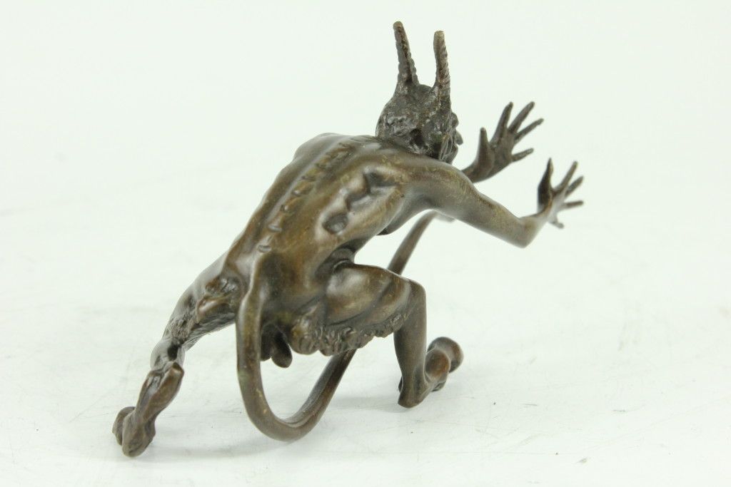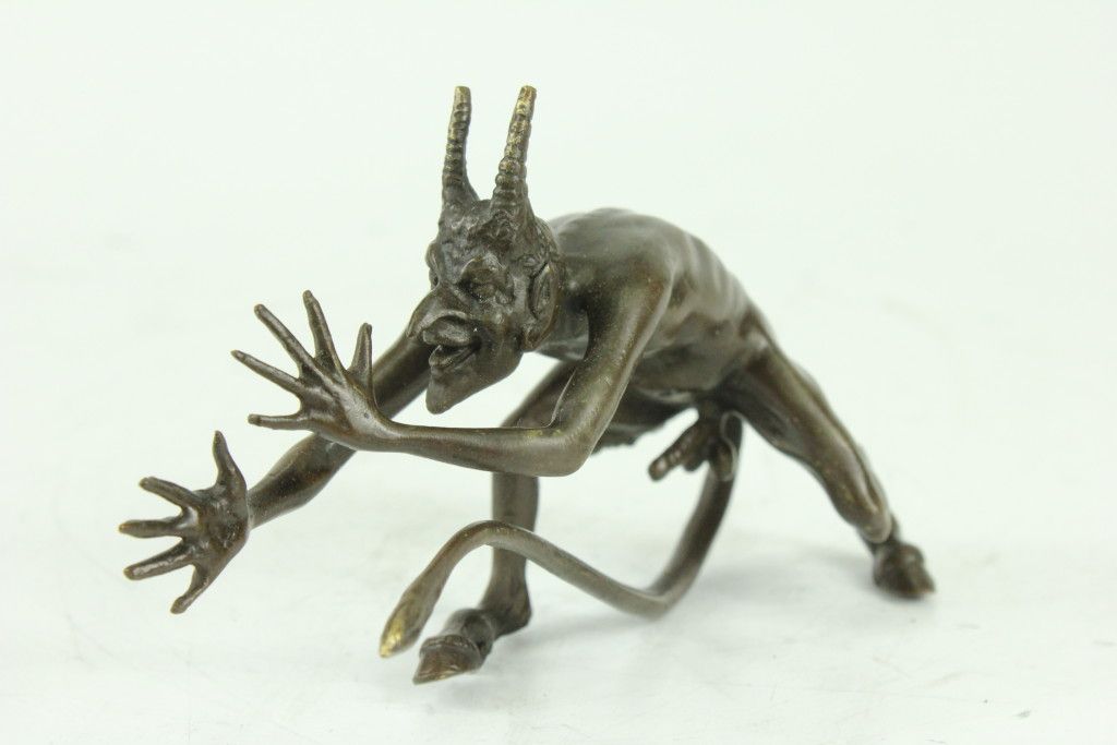 11RL01580 This Creepy And Very Scary Satyr Is Chasing Around A Nymph, But She Is Not Interesting In Him And His Overly Persisting Arouse Self. She Is Happy With Her Main Satyr, But Has Not Taking No For An Answer Chasing Her All Around. His Arms And Hands Are Extended And Spread Out As He Is Trying To Grab Something Or Someone. His Devil Face And Horns Are Very Frightening To Look At. This Satyr Mythological Creature Could Not Be Completely Understand. This Sculpture Is Made From Solid Bronze And Was Casted Using The "Lost Wax Method". It Has A Brown Patina For Preservation...................SHIPPING USA: $15....HI, ALASKA, CANADA: $35...ALL OTHER COUNTRIES: $59