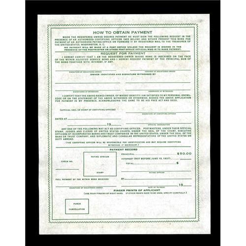 <B>3% $50 Adjusted Service Bond of 1945</B></I><BR>This is a most interesting United States Bond that was paid in 1936 to World War I veterans. These instruments were the culmination of a long struggle by many veterans to obtain payment of bonuses promised after the end of the First World War. The "Bonus Army," whose march on Washington ended in a contentious melee when regular army troops commanded by then Colonel Douglas MacArthur ousted them from their Washington campground, had long agitated for these bonds to be issued, which they were after approval by Congress in 1936. These bonds were given upon application only to veterans of the First World War, in an amount based on length of service between specified dates. They were redeemable only by the veteran or his estate, with each bond containing space on the reverse for four fingerprints from the right hand of every applicant for payment, a feature we have seen on no other government obligation of any kind. The final maturity date was June 15, 1945, and they drew no interest unless held for one year. Likely because of their issuance during the depths of the Great Depression, and their many restrictions, most all of these bonds were speedily redeemed. Treasury Seal embossing is deep on this <B>Choice Crisp Uncirculated</B></I> example.<BR><BR><b>Shipping:</b> Coin/Currency (<a target="_blank" href="http://www.heritageauctions.com/common/shipping.php">view shipping information</a>)