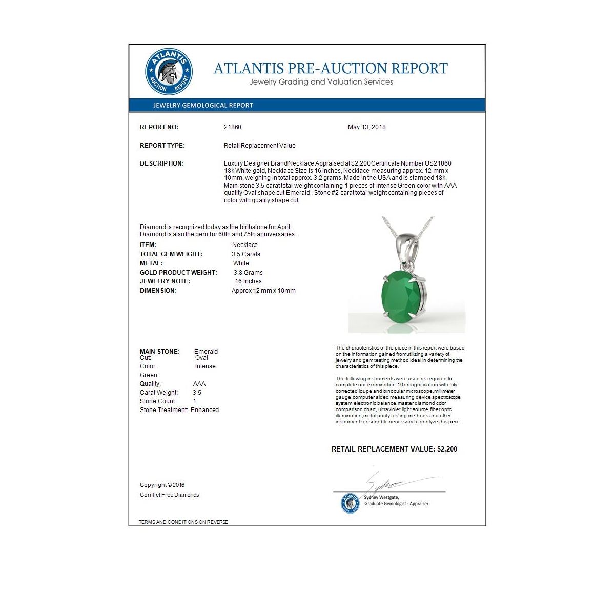 REF-33T3M -21860 ---- 3.50 CTW Emerald Designer Inspired Solitaire Necklace 18K White Gold ---- Luxury Designer Brand Necklace Appraised at $2,200 Certificate Number US21860 18k White gold, Necklace Size is 16 Inches, Necklace measuring approx. 12 mm x 10mm, weighing in total approx. 3.2 grams. Made in the USA and is stamped 18k, Main stone 3.5 carat total weight containing 1 pieces of Intense Green color with AAA quality Oval shape cut Emerald , Stone #2 carat total weight containing pieces of color with quality shape cut