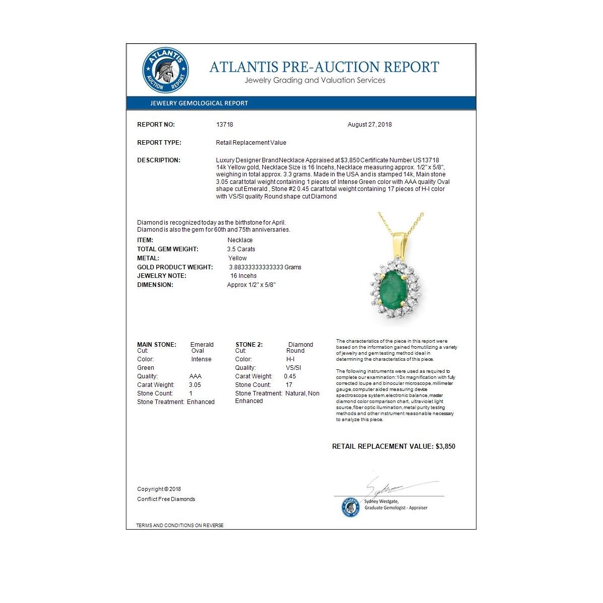 REF-58Y2K -13718 ---- 3.50 CTW Emerald & Diamond Necklace 14K Yellow Gold ---- Luxury Designer Brand Necklace Appraised at $3,850 Certificate Number US13718 14k Yellow gold, Necklace Size is 16 Incehs, Necklace measuring approx. 1/2" x 5/8", weighing in total approx. 3.3 grams. Made in the USA and is stamped 14k, Main stone 3.05 carat total weight containing 1 pieces of Intense Green color with AAA quality Oval shape cut Emerald , Stone #2 0.45 carat total weight containing 17 pieces of H-I color with VS/SI quality Round shape cut Diamond