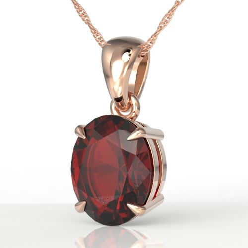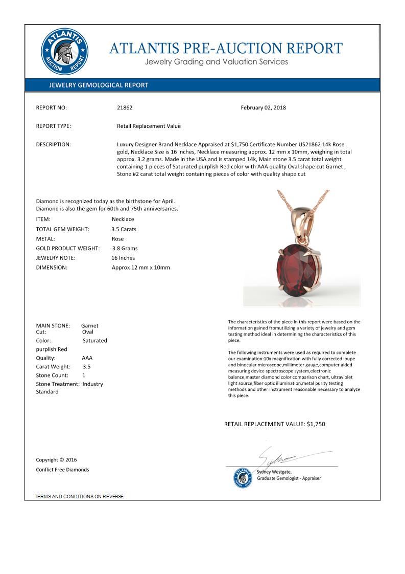 REF-29M3H -21862 ---- 3.50 CTW Garnet Designer Inspired Solitaire Necklace 14K Rose Gold ---- Luxury Designer Brand Necklace Appraised at $1,750 Certificate Number US21862 14k Rose gold, Necklace Size is 16 Inches, Necklace measuring approx. 12 mm x 10mm, weighing in total approx. 3.2 grams. Made in the USA and is stamped 14k, Main stone 3.5 carat total weight containing 1 pieces of Saturated purplish Red color with AAA quality Oval shape cut Garnet , Stone #2 carat total weight containing pieces of color with quality shape cut