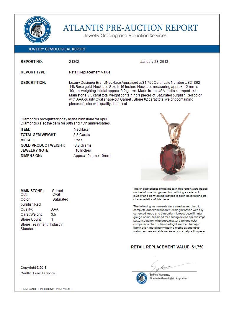 REF-29M3H -21862 ---- 3.50 CTW Garnet Designer Inspired Solitaire Necklace 14K Rose Gold ---- Luxury Designer Brand Necklace Appraised at $1,750 Certificate Number US21862 14k Rose gold, Necklace Size is 16 Inches, Necklace measuring approx. 12 mm x 10mm, weighing in total approx. 3.2 grams. Made in the USA and is stamped 14k, Main stone 3.5 carat total weight containing 1 pieces of Saturated purplish Red color with AAA quality Oval shape cut Garnet , Stone #2 carat total weight containing pieces of color with quality shape cut