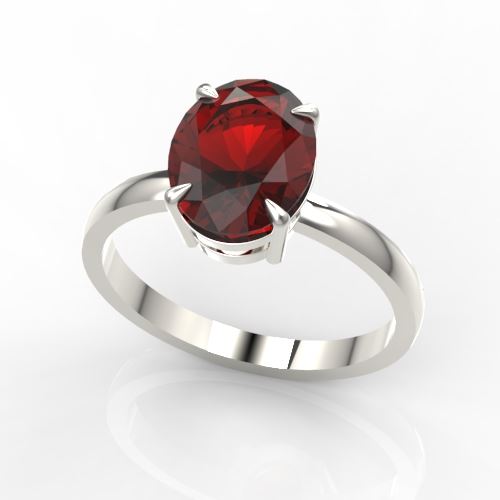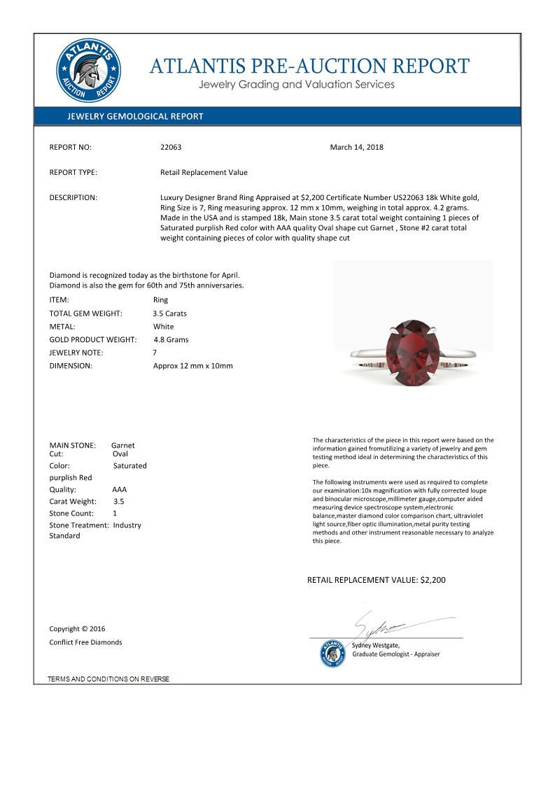 REF-36H2A -22063 ---- 3.50 CTW Garnet Designer Inspired Solitaire Ring 18K White Gold ---- Luxury Designer Brand Ring Appraised at $2,200 Certificate Number US22063 18k White gold, Ring Size is 7, Ring measuring approx. 12 mm x 10mm, weighing in total approx. 4.2 grams. Made in the USA and is stamped 18k, Main stone 3.5 carat total weight containing 1 pieces of Saturated purplish Red color with AAA quality Oval shape cut Garnet , Stone #2 carat total weight containing pieces of color with quality shape cut