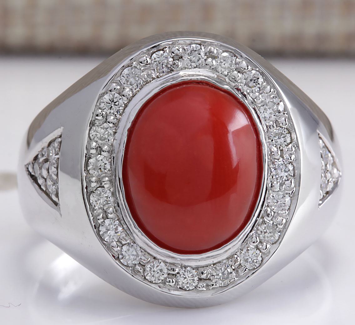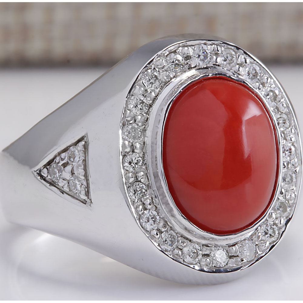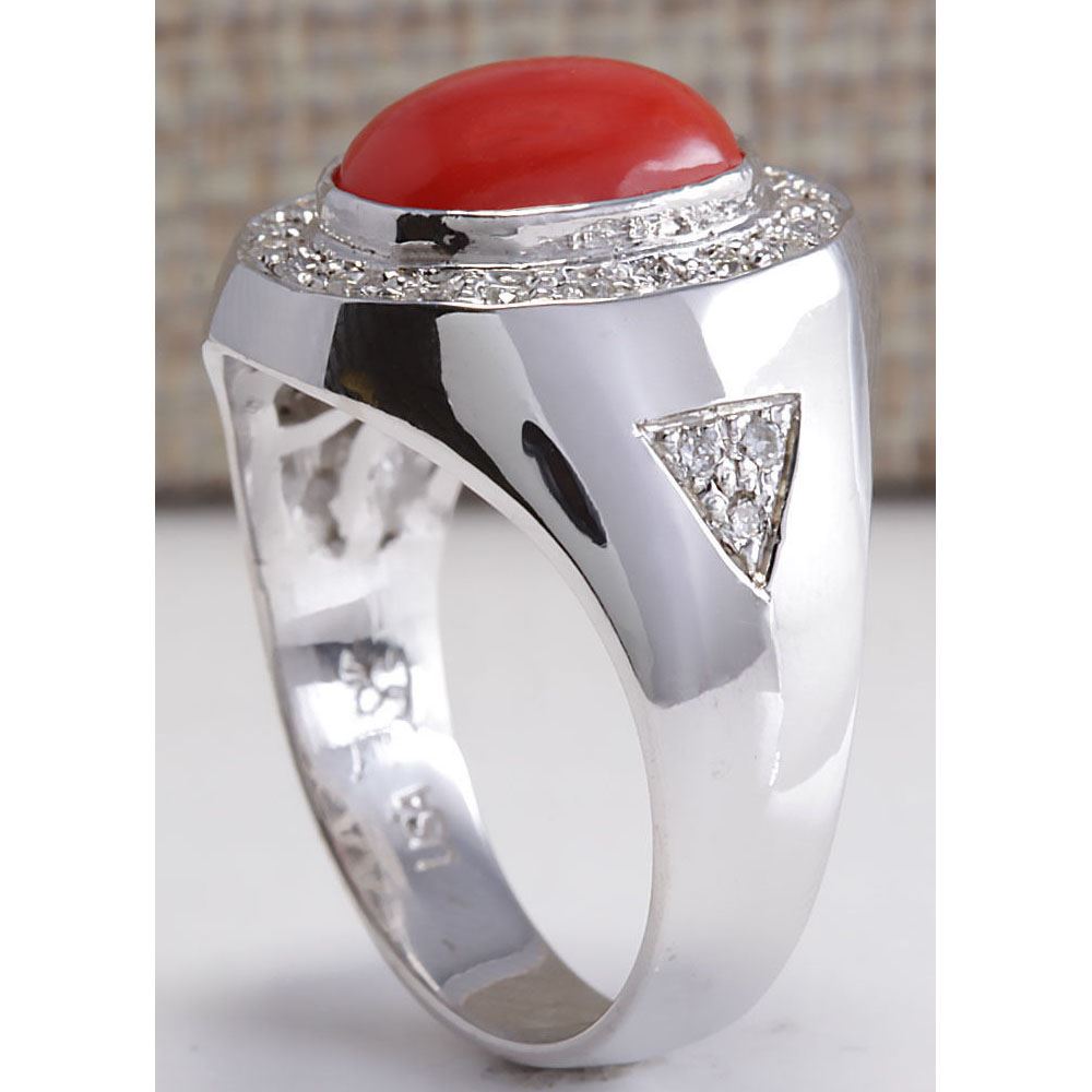 3.50 CTW Natural Red Coral And Diamond Ring 14K Solid White Gold