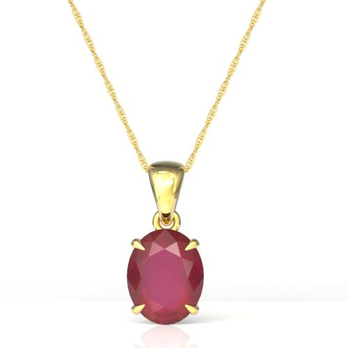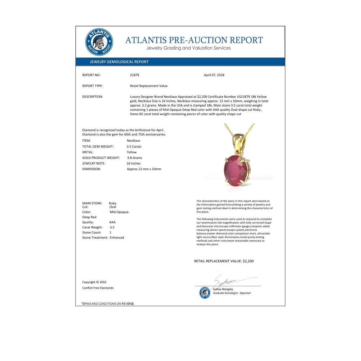 REF-33F3N -21879 ---- 3.50 CTW Ruby Designer Inspired Solitaire Necklace 18K Yellow Gold ---- Luxury Designer Brand Necklace Appraised at $2,200 Certificate Number US21879 18k Yellow gold, Necklace Size is 16 Inches, Necklace measuring approx. 12 mm x 10mm, weighing in total approx. 3.2 grams. Made in the USA and is stamped 18k, Main stone 3.5 carat total weight containing 1 pieces of Mid-Opaque-Deep Red color with AAA quality Oval shape cut Ruby , Stone #2 carat total weight containing pieces of color with quality shape cut
