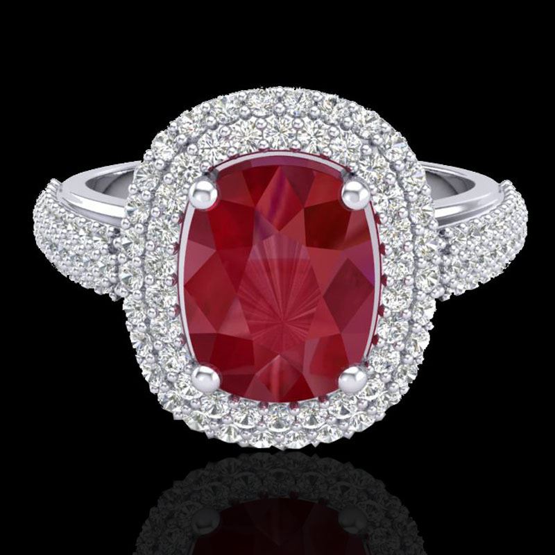 REF-143T6M -20721 ---- 3.50 CTW Ruby & Micro Pave VS/SI Diamond Halo Ring 18K White Gold ---- Luxury Designer Brand Ring Appraised at $11,050 Certificate Number US20721 18k White gold, Ring Size is 7, Ring measuring approx. 1/2" X 9/16" , weighing in total approx. 7.7 grams. Made in the USA and is stamped 18k, Main stone 2.5 carat total weight containing 1 pieces of Mid-Opaque-Deep Red color with AAA quality Cushion shape cut Ruby , Stone #2 1 carat total weight containing 122 pieces of H-I color with VS/SI quality Round shape cut Diamond