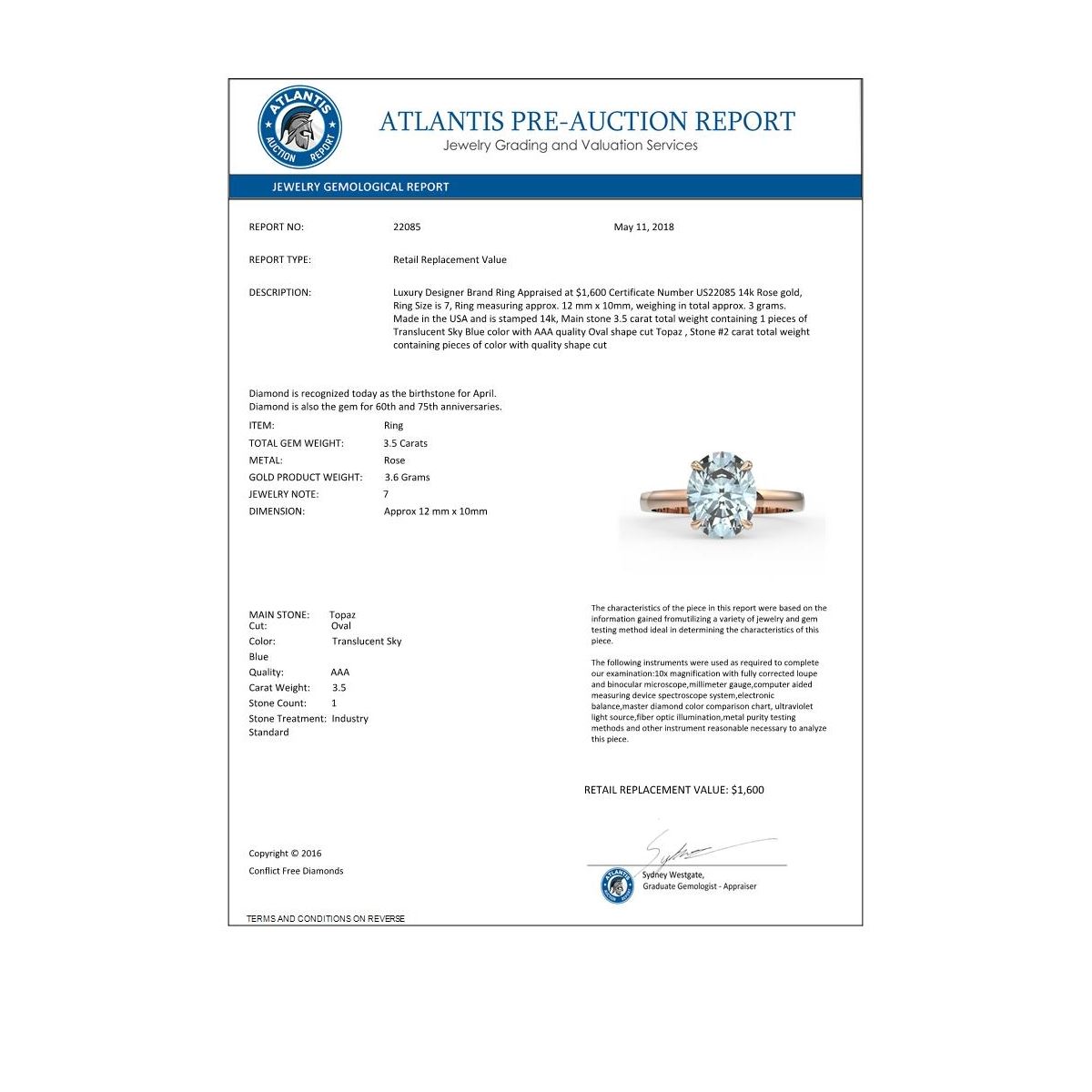 REF-24K5W -22085 ---- 3.50 CTW Sky Blue Topaz Designer Inspired Solitaire Ring 14K Rose Gold ---- Luxury Designer Brand Ring Appraised at $1,600 Certificate Number US22085 14k Rose gold, Ring Size is 7, Ring measuring approx. 12 mm x 10mm, weighing in total approx. 3 grams. Made in the USA and is stamped 14k, Main stone 3.5 carat total weight containing 1 pieces of Translucent Sky Blue color with AAA quality Oval shape cut Topaz , Stone #2 carat total weight containing pieces of color with quality shape cut