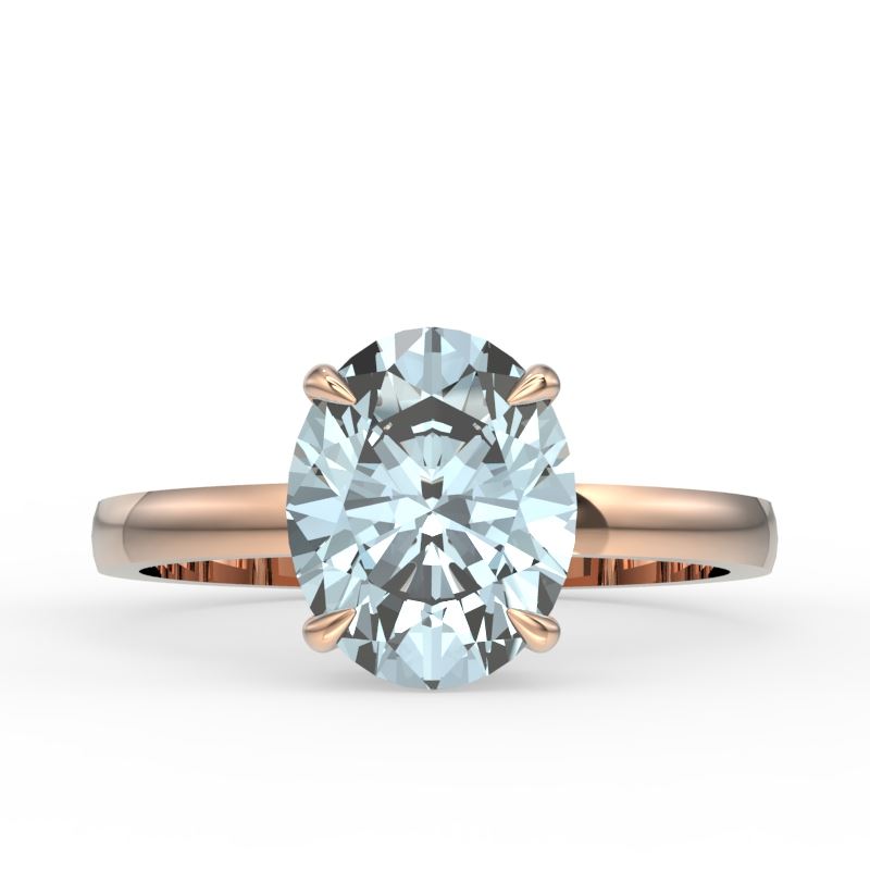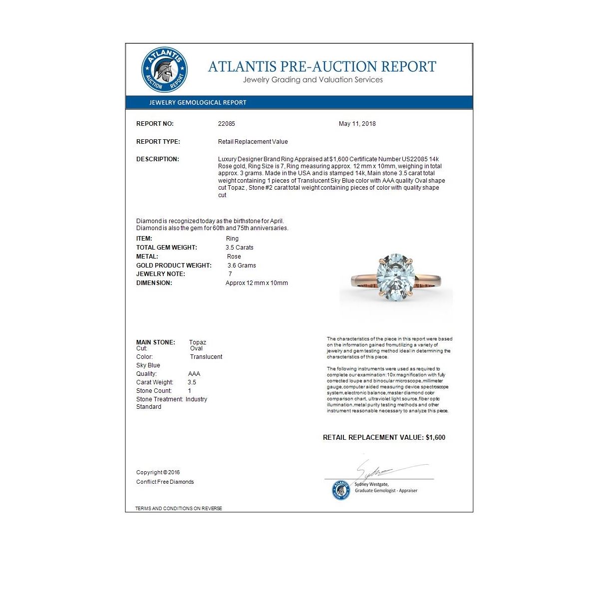 REF-24K5W -22085 ---- 3.50 CTW Sky Blue Topaz Designer Inspired Solitaire Ring 14K Rose Gold ---- Luxury Designer Brand Ring Appraised at $1,600 Certificate Number US22085 14k Rose gold, Ring Size is 7, Ring measuring approx. 12 mm x 10mm, weighing in total approx. 3 grams. Made in the USA and is stamped 14k, Main stone 3.5 carat total weight containing 1 pieces of Translucent Sky Blue color with AAA quality Oval shape cut Topaz , Stone #2 carat total weight containing pieces of color with quality shape cut