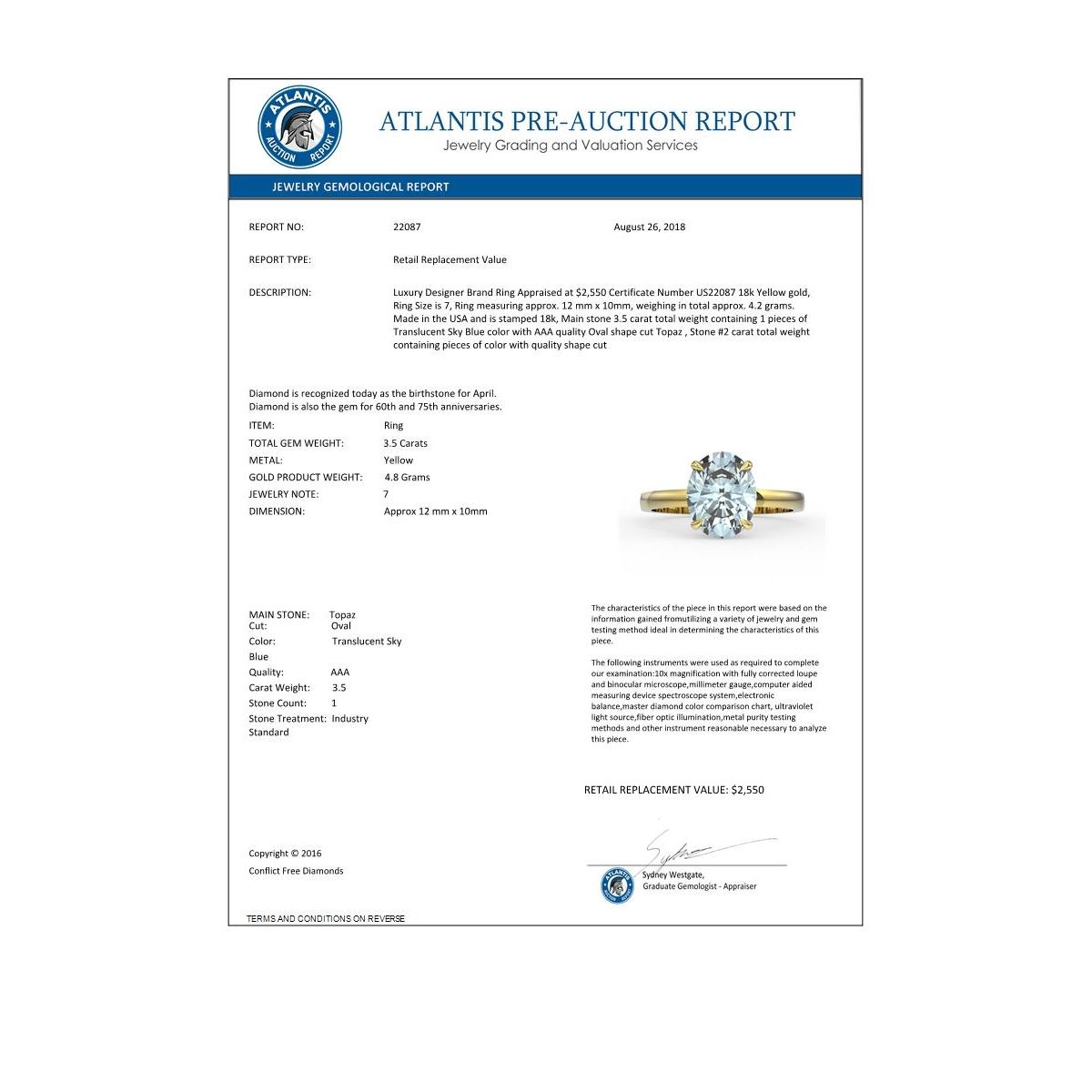 REF-36F2N -22087 ---- 3.50 CTW Sky Blue Topaz Designer Inspired Solitaire Ring 18K Yellow Gold ---- Luxury Designer Brand Ring Appraised at $2,550 Certificate Number US22087  18k Yellow gold,  Ring Size is 7, Ring measuring approx. 12 mm x 10mm, weighing in total approx. 4.2 grams. Made in the USA and is stamped 18k, Main stone 3.5 carat total weight containing 1 pieces of Translucent Sky Blue color with AAA quality Oval shape cut Topaz , Stone #2  carat total weight containing  pieces of  color with quality  shape cut