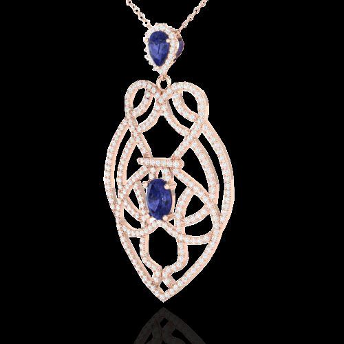REF-191H3A -21254 ---- 3.50 CTW Tanzanite & Micro VS/SI Diamond Heart Necklace Solitaire 14K Rose Gold ---- Luxury Designer Brand Necklace Appraised at $14,750 Certificate Number US21254 14k Rose gold, Necklace Size is 16 Inches, Necklace measuring approx. 2" x 1" , weighing in total approx. 8.8 grams. Made in the USA and is stamped 14k, Main stone 1.1 carat total weight containing 1 pieces of Intense Violet Blue color with AAA quality Oval shape cut Tanzanite , Stone #2 0.5 carat total weight containing 1 pieces of Intense Blusih Purple color with AA quality Pear shape cut Tanzanite , Stone #3 1.9 carat total weight containing 227 pieces of G-H color with VS/SI quality Round shape cut Diamond