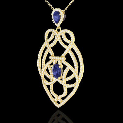 REF-191T3M -21256 ---- 3.50 CTW Tanzanite & Micro VS/SI Diamond Heart Necklace Solitaire 14K Yellow Gold ---- Luxury Designer Brand Necklace Appraised at $14,750 Certificate Number US21256 14k Yellow gold, Necklace Size is 16 Inches, Necklace measuring approx. 2" x 1" , weighing in total approx. 8.8 grams. Made in the USA and is stamped 14k, Main stone 1.1 carat total weight containing 2 pieces of Intense Violet Blue color with AAA quality Oval shape cut Tanzanite , Stone #2 0.5 carat total weight containing 1 pieces of Intense Blusih Purple color with AA quality Pear shape cut Tanzanite , Stone #3 1.9 carat total weight containing 227 pieces of G-H color with VS/SI quality Round shape cut Diamond