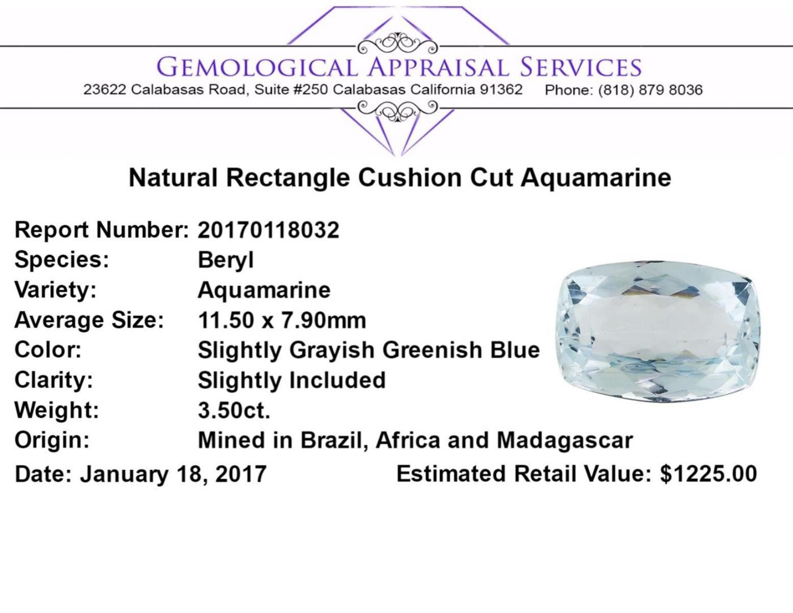 One natural rectangle cushion cut aquamarine with an exact weight of 3.50ct., clarity is slightly included, slightly grayish greenish blue. Gemological Appraisals Services estimates the retail value at $1225 GAS Appraised.