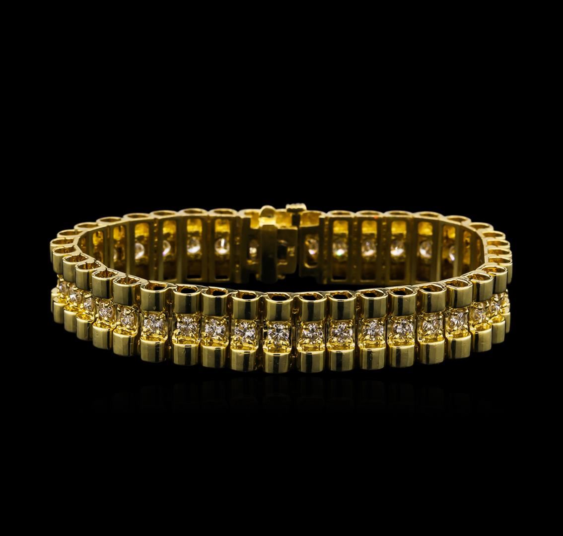 One electronically tested 14KT yellow gold lady's combination cast & assembled fashion bracelet with a tongue clasp with foldover safety with a bright polish finish. The featured lady's bracelet measures approximately 7 inches in length. Identified with markings of "14K". Condition is like new, good workmanship. Containing: Thirty-Nine prong set round brilliant cut diamonds, measuring 2.90 - 2.80 x 1.77mm (depth est.) approximate total weight of 39 Stones = 3.50ct. Graded in the setting. Clarity: SI-1 to SI-2. Color: H - I. Cut Good. Total Weight of Diamonds 3.50ct. Total Weight of Bracelet 35.30gm. GAS Appraised at $12,110.00.