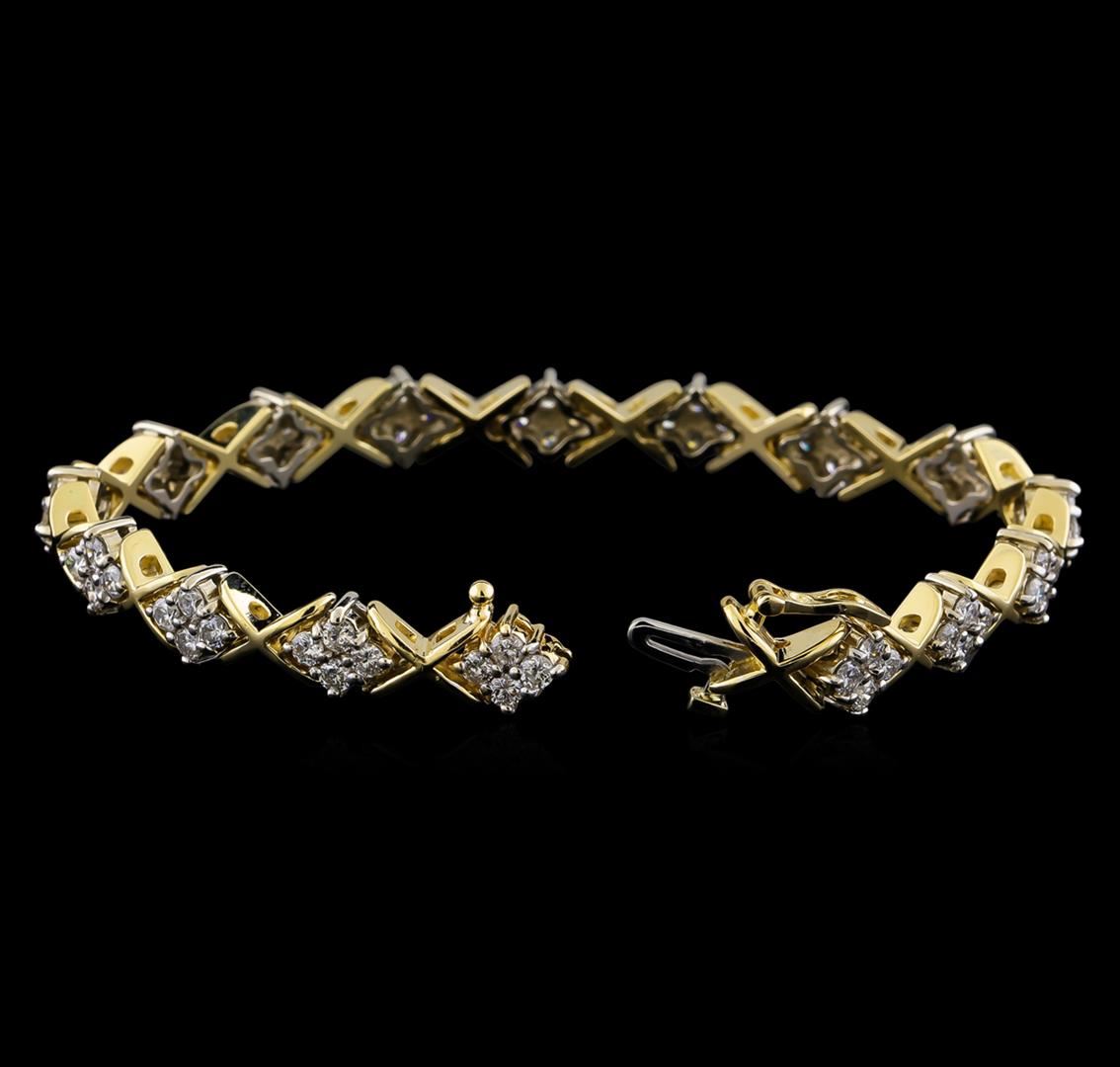 One electronically tested 14KT yellow and white gold lady's combination cast & assembled fashion straight line bracelet with a tongue clasp with foldover safety with a bright polish finish. The featured lady's straight line bracelet measures 7 inches in length. Identified with markings of "14K". Condition is new, good workmanship. Containing: Sixty-Four prong set round brilliant cut diamonds, measuring 2.50 - 2.40 x 1.52mm (depth est.) approximate total weight of 64 Stones = 3.50ct. Graded in the setting. Clarity: SI-1 to SI-2. Color: G - I. Cut Good. Total Weight of Diamonds 3.50ct. Total Weight of Straight Line Bracelet 24.00gm. GAS Appraised at $10,255.00.