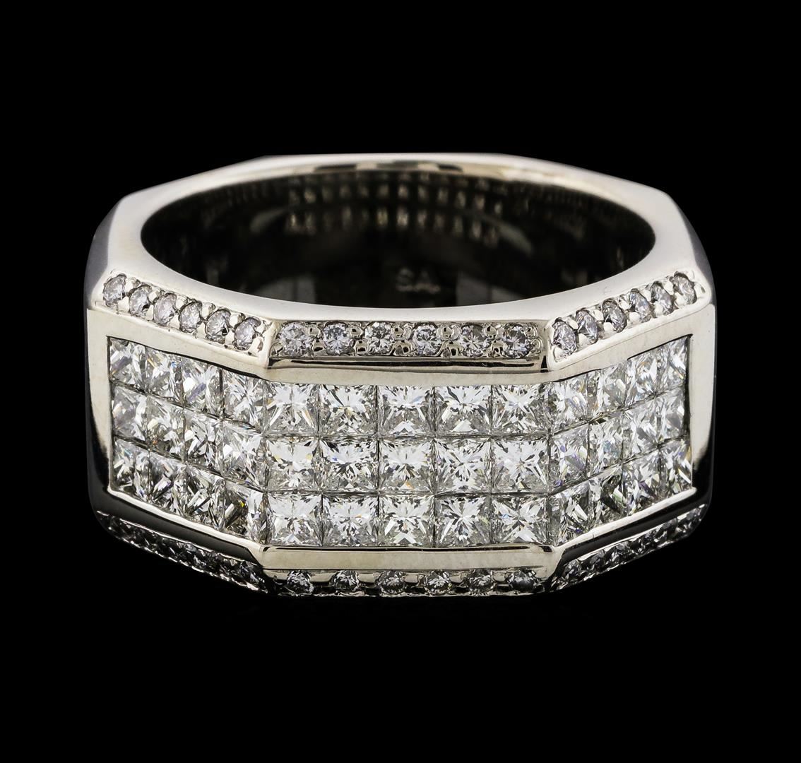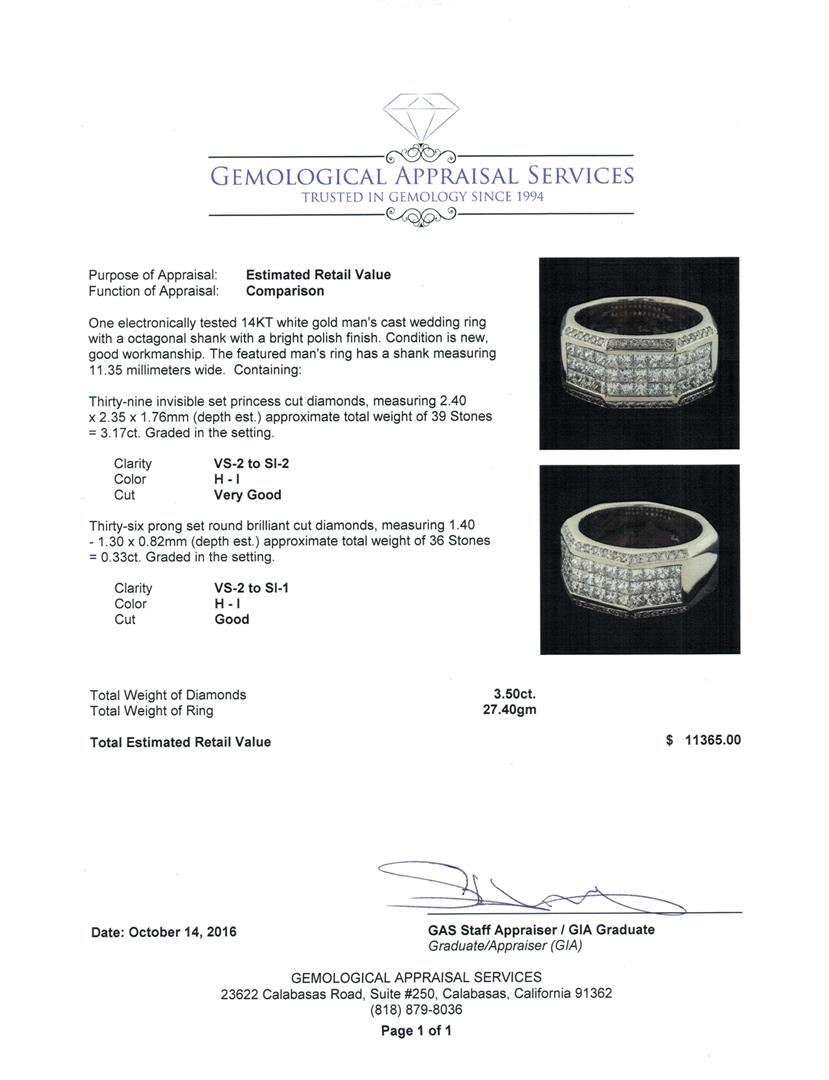 One electronically tested 14KT white gold man's cast wedding ring with a octagonal shank with a bright polish finish. The featured man's ring has a shank measuring 11.35 millimeters wide. Condition is new, good workmanship. Containing: Thirty-Nine invisible set princess cut diamonds, measuring 2.40 x 2.35 x 1.76mm (depth est.) approximate total weight of 39 Stones = 3.17ct. Graded in the setting. Clarity VS-2 to SI-2. Color: H - I Cut Very Good Thirty-Six prong set round brilliant cut diamonds, measuring 1.40 - 1.30 x 0.82mm (depth est.) approximate total weight of 36 Stones = 0.33ct. Graded in the setting. Clarity VS-2 to SI-1. Color: H - I Cut Good. Total Weight of Diamonds 3.50ct.. Total Weight of Ring 27.40gm. GAS Appraised at $11,365.00.
