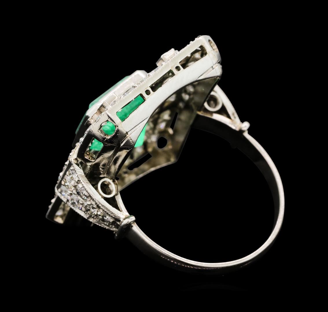 One electronically tested platinum lady's cast vintage style fashion ring with a tapered shank with a bright polish with milgrain detailing finish. The featured lady's ring has scrolled shoulders and a shank measuring 2.28 millimeters wide. Condition is like new, good workmanship. Containing: One bezel set square emerald standard step cut natural emerald, measuring 8.75 x 8.70 x 6.39mm, (depth est.) approximate weight of 3.30ct., clarity is heavily included, medium, very slightly grayish, green color, (GIA G 5/3), cut is very good. Transmitting light somewhat diffusely, semi-transparent to translucent. Indications of oil residue. Naturally occurring internal & external characteristics are present. Colored gemstones are presumed to have been subjected to commonly used enhancement processes. Graded in the setting. Eight prong set square emerald standard step cut natural emeralds, measuring 1.70 x 1.60 x 1.07mm, (depth est.) approximate total weight of 0.20ct., clarity is moderately included, medium light, moderately strong, green color, (GIA G 4/4), cut is good. Transmitting light somewhat diffusely, transparent to translucent. Indications of oil residue. Naturally occurring internal & external characteristics are present. Colored gemstones are presumed to have been subjected to commonly used enhancement processes. Graded in the setting. Sixty-Six prong set round brilliant cut diamonds, measuring 2.00 - 1.60 x 1.12mm (depth est.) approximate total weight of 66 Stones = 1.50ct. Graded in the setting. Color G - I Clarity SI-1 to SI-3 Cut Good. Total Weight of Colored Stones 3.50ct.. Total Weight of Diamonds 1.50ct.. Total Weight of Ring 9.10gm GAS Appraised at $8,280.00.