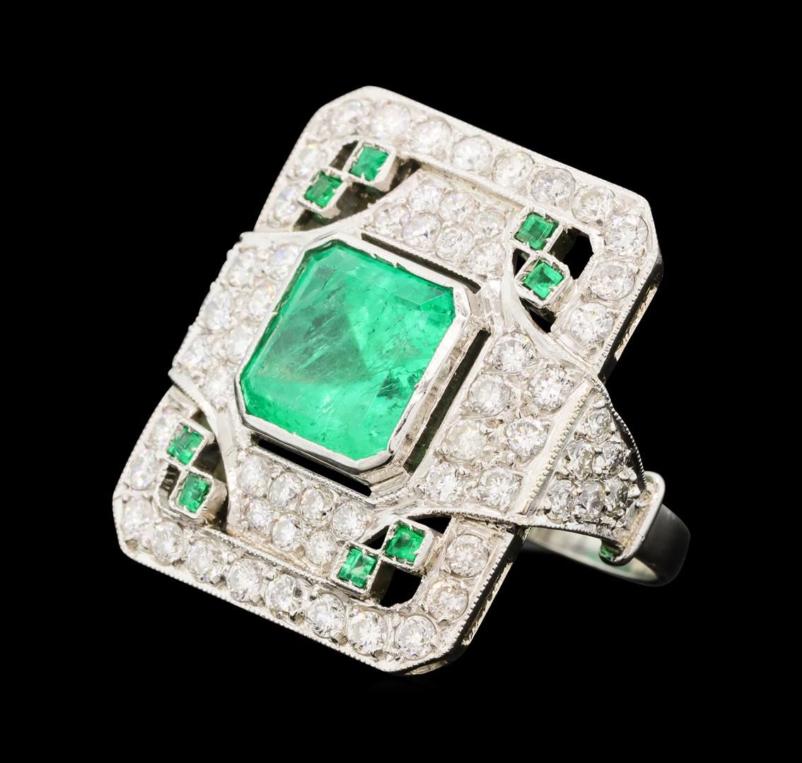 One electronically tested platinum lady's cast vintage style fashion ring with a tapered shank with a bright polish with milgrain detailing finish. The featured lady's ring has scrolled shoulders and a shank measuring 2.28 millimeters wide. Condition is like new, good workmanship. Containing: One bezel set square emerald standard step cut natural emerald, measuring 8.75 x 8.70 x 6.39mm, (depth est.) approximate weight of 3.30ct., clarity is heavily included, medium, very slightly grayish, green color, (GIA G 5/3), cut is very good. Transmitting light somewhat diffusely, semi-transparent to translucent. Indications of oil residue. Naturally occurring internal & external characteristics are present. Colored gemstones are presumed to have been subjected to commonly used enhancement processes. Graded in the setting. Eight prong set square emerald standard step cut natural emeralds, measuring 1.70 x 1.60 x 1.07mm, (depth est.) approximate total weight of 0.20ct., clarity is moderately included, medium light, moderately strong, green color, (GIA G 4/4), cut is good. Transmitting light somewhat diffusely, transparent to translucent. Indications of oil residue. Naturally occurring internal & external characteristics are present. Colored gemstones are presumed to have been subjected to commonly used enhancement processes. Graded in the setting. Sixty-Six prong set round brilliant cut diamonds, measuring 2.00 - 1.60 x 1.12mm (depth est.) approximate total weight of 66 Stones = 1.50ct. Graded in the setting. Color G - I Clarity SI-1 to SI-3 Cut Good. Total Weight of Colored Stones 3.50ct.. Total Weight of Diamonds 1.50ct.. Total Weight of Ring 9.10gm GAS Appraised at $8,280.00.