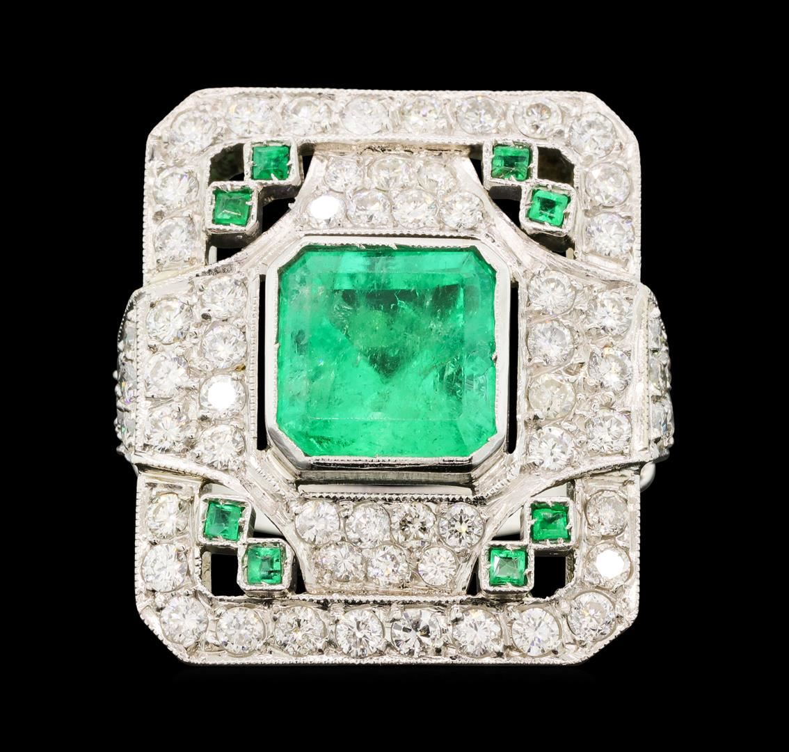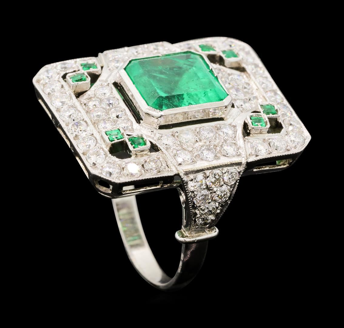 One electronically tested platinum lady's cast vintage style fashion ring with a tapered shank with a bright polish with milgrain detailing finish. The featured lady's ring has scrolled shoulders and a shank measuring 2.28 millimeters wide. Condition is like new, good workmanship. Containing: One bezel set square emerald standard step cut natural emerald, measuring 8.75 x 8.70 x 6.39mm, (depth est.) approximate weight of 3.30ct., clarity is heavily included, medium, very slightly grayish, green color, (GIA G 5/3), cut is very good. Transmitting light somewhat diffusely, semi-transparent to translucent. Indications of oil residue. Naturally occurring internal & external characteristics are present. Colored gemstones are presumed to have been subjected to commonly used enhancement processes. Graded in the setting. Eight prong set square emerald standard step cut natural emeralds, measuring 1.70 x 1.60 x 1.07mm, (depth est.) approximate total weight of 0.20ct., clarity is moderately included, medium light, moderately strong, green color, (GIA G 4/4), cut is good. Transmitting light somewhat diffusely, transparent to translucent. Indications of oil residue. Naturally occurring internal & external characteristics are present. Colored gemstones are presumed to have been subjected to commonly used enhancement processes. Graded in the setting. Sixty-Six prong set round brilliant cut diamonds, measuring 2.00 - 1.60 x 1.12mm (depth est.) approximate total weight of 66 Stones = 1.50ct. Graded in the setting. Color G - I Clarity SI-1 to SI-3 Cut Good. Total Weight of Colored Stones 3.50ct.. Total Weight of Diamonds 1.50ct.. Total Weight of Ring 9.10gm GAS Appraised at $8,280.00.