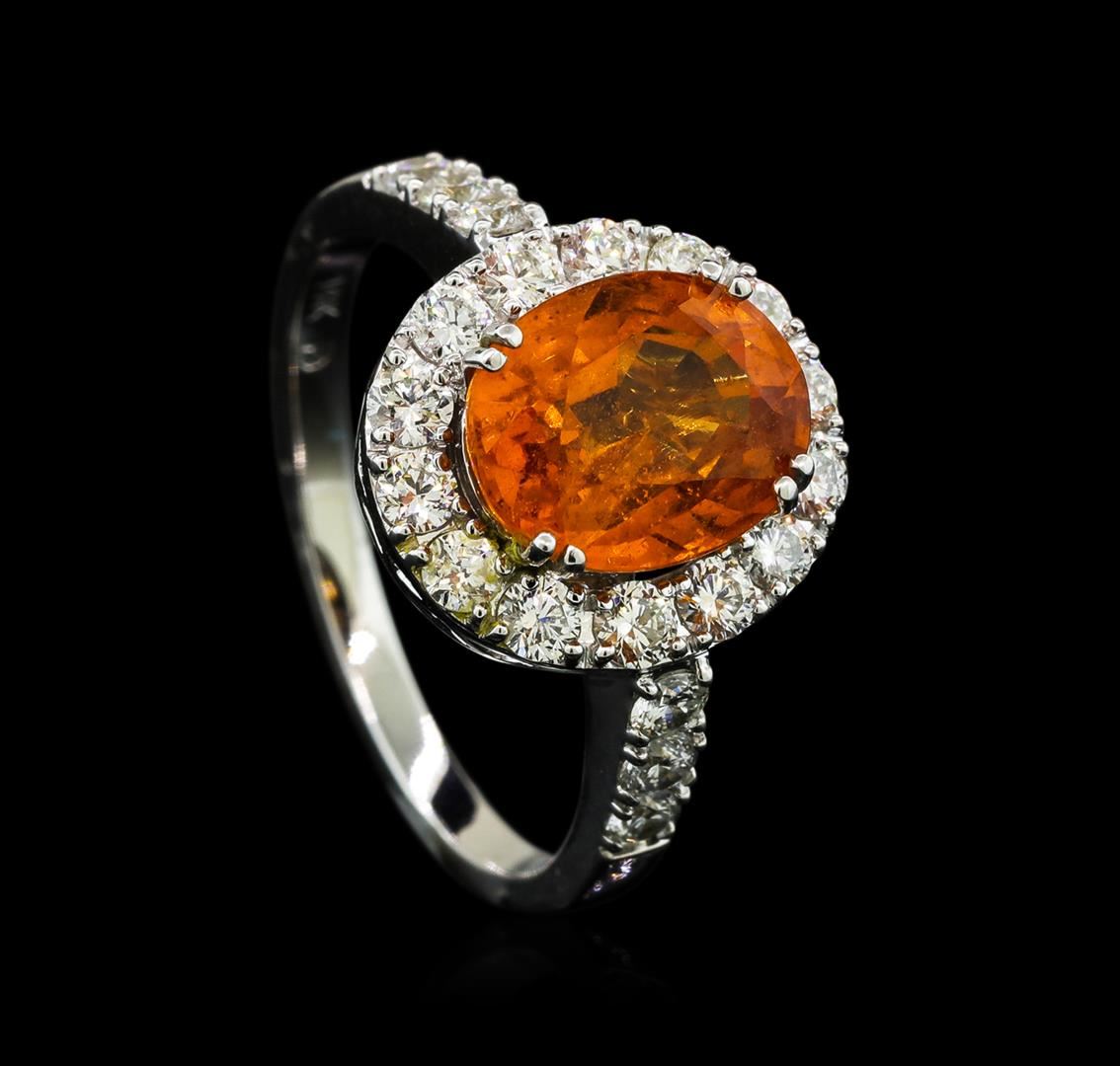 One electronically tested 14KT white gold lady's cast fashion ring with a basket halo with a bright polish finish. The featured lady's ring has a shank measuring 1.80 millimeters wide. Identified with markings of '14K'. Condition is new, good workmanship. Containing: One prong set oval modified brilliant cut natural mandarin spessartite, measuring 9.44 x 7.60 x 5.02mm, (depth est.) 10%. bulge factor, approximate weight of 3.50ct., clarity is moderately included, medium, moderately strong, orange color, (GIA O 5/4), cut is good. Transmitting light somewhat diffusely, transparent to translucent. Colored gemstones are presumed to have been subjected to commonly used enhancement processes. Graded in the setting. Twenty prong set round brilliant cut diamonds, measuring 2.25 - 2.15 x 1.36mm (depth est.) approximate total weight of 20 Stones = 0.80ct. Graded in the setting. Clarity VS-1 to SI-1. Color: G - H Cut Very Good. Total Weight of Colored Stones 3.50ct.. Total Weight of Diamonds 0.80ct.. Total Weight of Ring 4.50gm GAS Appraised at $5,865.00.