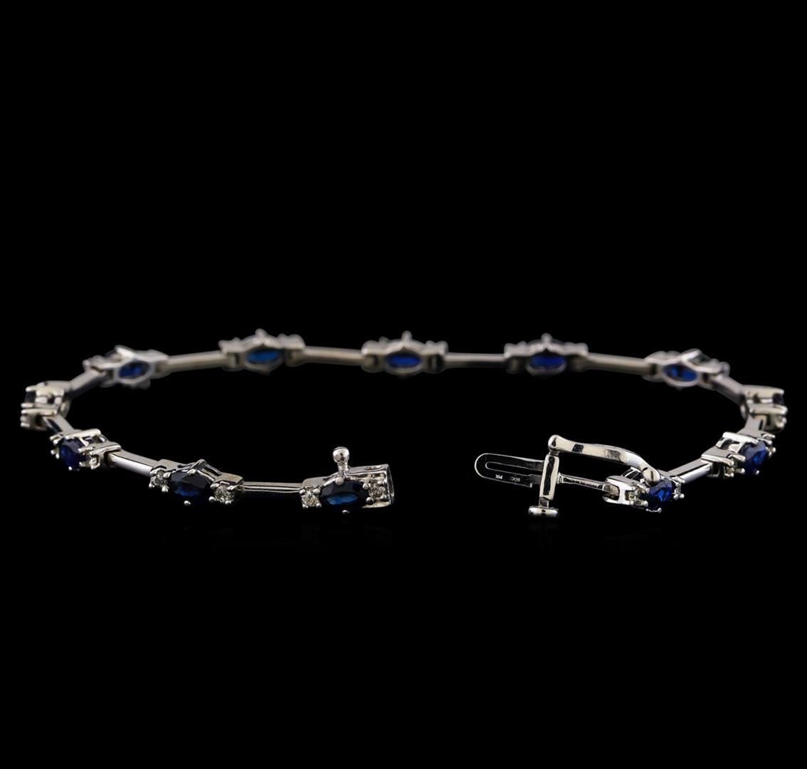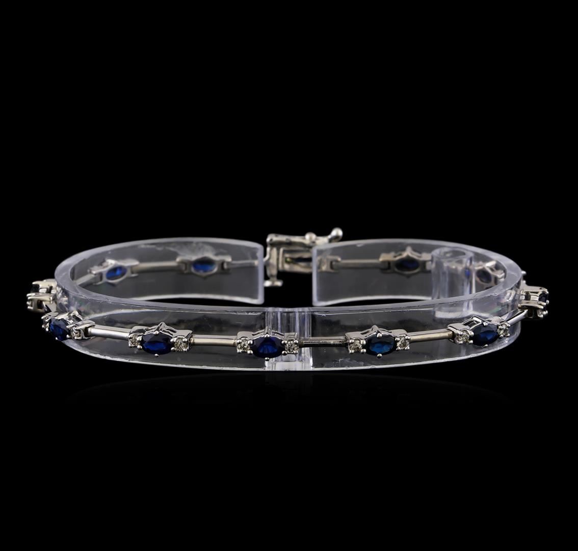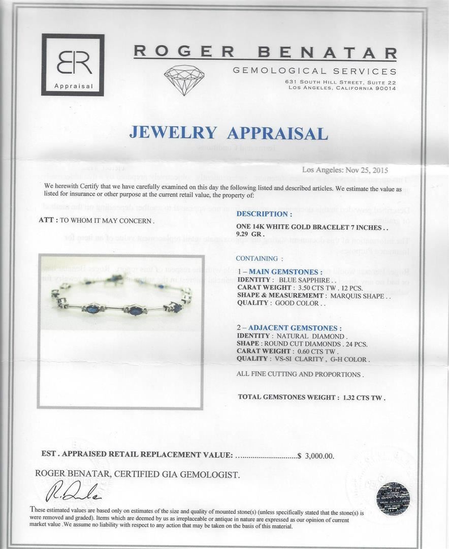 One 14K white gold bracelet 7 inches. 9.29 GR. Containing: Main gemstones: Identity: Blue sapphire. Carat weight: 3.50 CTS TW. 12 PCS. Shape and measurement: Marquis shape. Quality: Good color. Adjacent gemstones: Identity: Natural diamond. Shape: Round cut diamonds. 24 PCS. Carat weight: ),60 CTS TW. Quality: VS-SI clarity, g-h color. All fine cutting and proportions. total gemstones weight: 1.32 CTS TW. RBGS Appraised at $3,000.00.