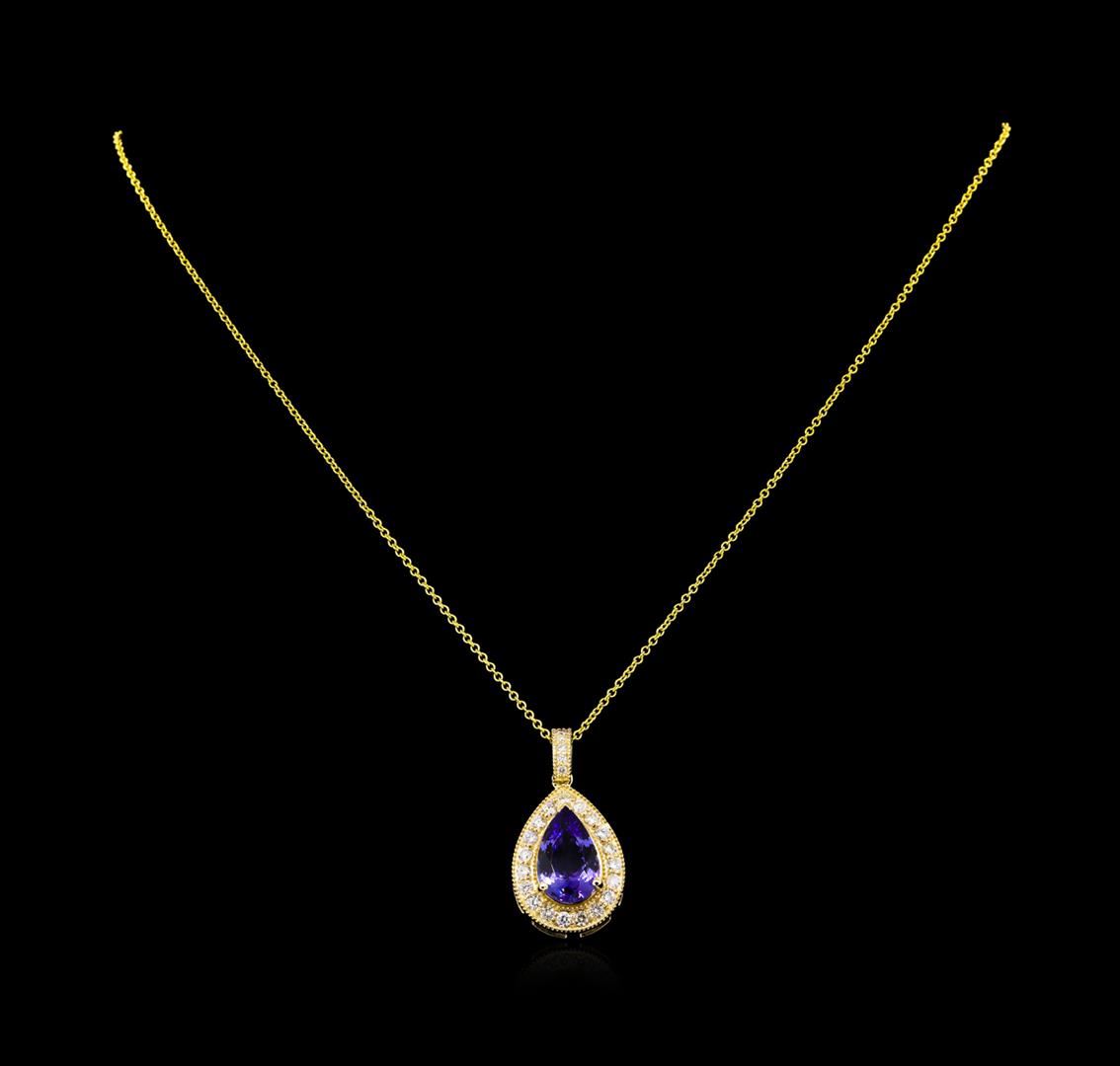 One electronically tested 14KT yellow gold lady's combination cast & assembled tear drop halo pendant & chain 17.0" long, 1.3mm round cable link with a spring ring clasp with a bright polish with milgrain detailing finish. Identified with markings of "K14". Condition is new, good workmanship. Containing: One prong set pear modified brilliant cut natural tanzanite, measuring 13.25 x 8.23 x 4.98mm, approximate weight of 3.50ct., clarity is eye clean, type I, medium, very slightly grayish, bluish violet color, (GIA bV 5/3), cut is very good. Transmitting light with no distortion, transparent. Colored gemstones are presumed to have been subjected to commonly used enhancement processes. Graded in the setting. Nineteen prong set round brilliant cut diamonds, measuring 2.10 - 2.00 x 1.23mm (depth est.) approximate total weight of 19 Stones = 0.60ct. Graded in the setting. Clarity: SI-1 to SI-2. Color: H - I. Cut Good Six prong set round brilliant cut diamonds, measuring 1.40 - 1.35 x 0.86mm (depth est.) approximate total weight of 6 Stones = 0.06ct. Graded in the setting. Clarity: SI-1 to SI. Color: H - I. Cut Good. Total Weight of Colored Stones 3.50ct. Total Weight of Diamonds 0.66ct. Total Weight of Pendant & Chain 5.50gm. GAS Appraised at $7,585.00.