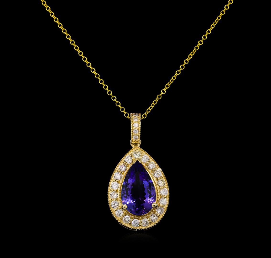 One electronically tested 14KT yellow gold lady's combination cast & assembled tear drop halo pendant & chain 17.0" long, 1.3mm round cable link with a spring ring clasp with a bright polish with milgrain detailing finish. Identified with markings of "K14". Condition is new, good workmanship. Containing: One prong set pear modified brilliant cut natural tanzanite, measuring 13.25 x 8.23 x 4.98mm, approximate weight of 3.50ct., clarity is eye clean, type I, medium, very slightly grayish, bluish violet color, (GIA bV 5/3), cut is very good. Transmitting light with no distortion, transparent. Colored gemstones are presumed to have been subjected to commonly used enhancement processes. Graded in the setting. Nineteen prong set round brilliant cut diamonds, measuring 2.10 - 2.00 x 1.23mm (depth est.) approximate total weight of 19 Stones = 0.60ct. Graded in the setting. Clarity: SI-1 to SI-2. Color: H - I. Cut Good Six prong set round brilliant cut diamonds, measuring 1.40 - 1.35 x 0.86mm (depth est.) approximate total weight of 6 Stones = 0.06ct. Graded in the setting. Clarity: SI-1 to SI. Color: H - I. Cut Good. Total Weight of Colored Stones 3.50ct. Total Weight of Diamonds 0.66ct. Total Weight of Pendant & Chain 5.50gm. GAS Appraised at $7,585.00.