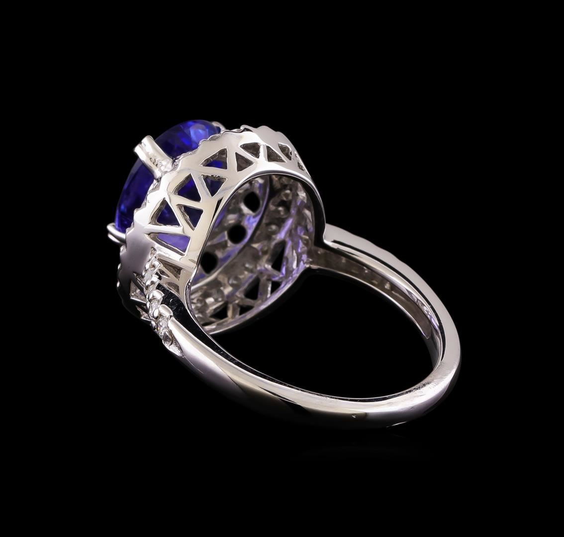 One electronically tested 14KT white gold lady's cast fashion ring with a halo with a bright polish finish. The featured lady's ring has a shank measuring 2.20 millimeters wide. Identified with markings of "14K". Condition is new, good workmanship. Containing: One prong set oval modified brilliant cut natural tanzanite, measuring 11.17 x 8.30 x 5.57mm, (depth est.) approximate weight of 3.50ct., clarity is eye clean, medium dark, moderately strong, violetish blue color, (GIA vB 6/4), cut is very good. Transmitting light with no distortion, transparent. Colored gemstones are presumed to have been subjected to commonly used enhancement processes. Graded in the setting. Eight prong set round brilliant cut diamonds, measuring 1.60 - 1.55 x 0.98mm (depth est.) approximate total weight of 8 Stones = 0.12ct. Graded in the setting. Clarity: SI-1 to SI-2. Color: H - I. Cut Good Twenty-Eight prong set round brilliant cut diamonds, measuring 1.40 - 1.35 x 0.86mm (depth est.) approximate total weight of 28 Stones = 0.28ct. Graded in the setting. Clarity: SI-1 to SI-2. Color: H - I. Cut Good. Total Weight of Colored Stones 3.50ct. Total Weight of Diamonds 0.40ct. Total Weight of Ring 5.60gm. GAS Appraised at $7,845.00.