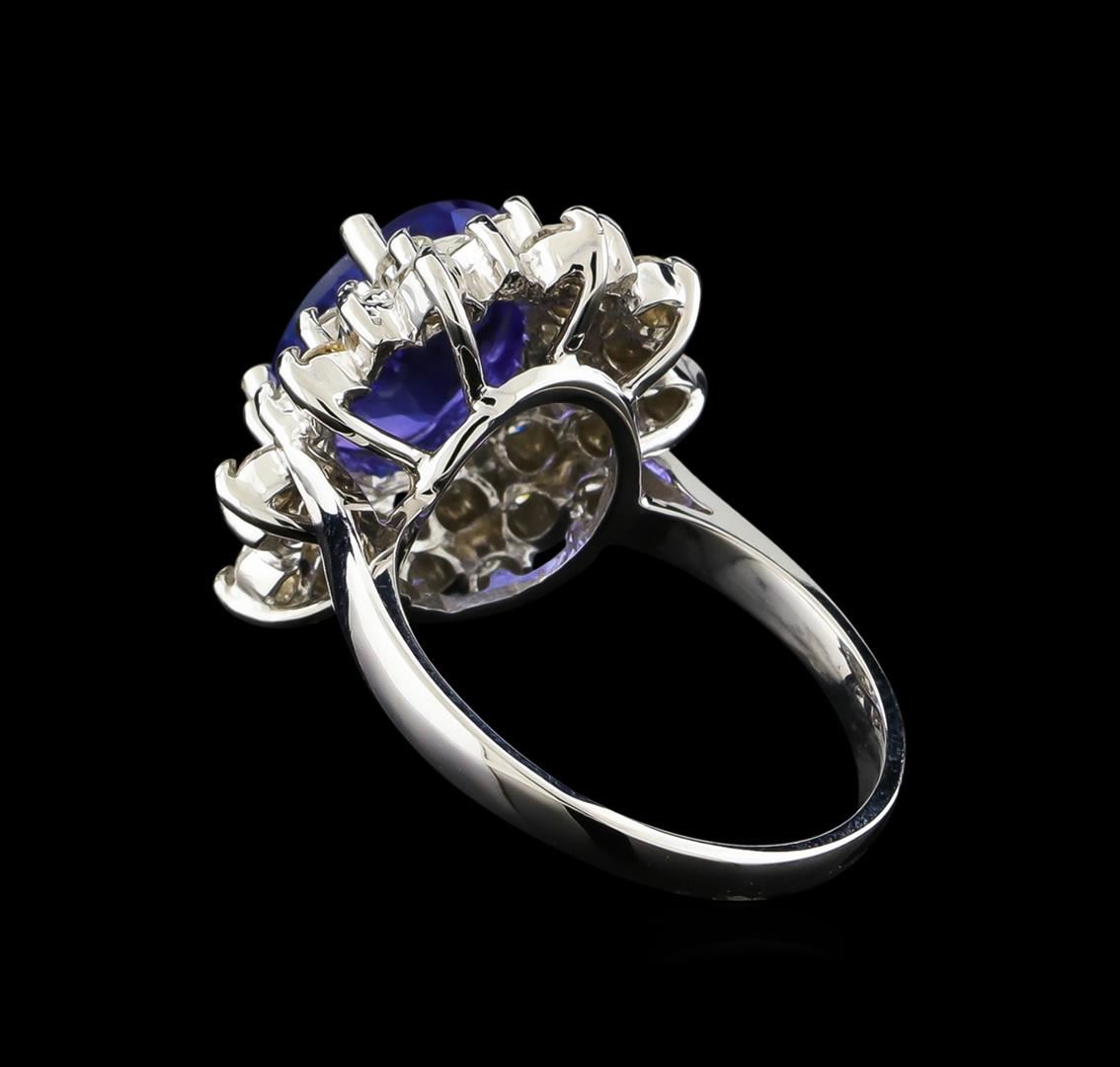One electronically tested 14KT white gold lady's cast fashion ring with a double basket halo with a bright polish finish. The featured lady's ring has a shank measuring 2.05 millimeters wide. Identified with markings of "K14". Condition is new, good workmanship. Containing: One prong set oval modified brilliant cut natural tanzanite, measuring 11.05 x 8.16 x 5.34mm, approximate weight of 3.50ct., clarity is eye clean, type I, medium dark, moderately strong, violetish blue color, (GIA vB 6/4), cut is very good. Transmitting light with no distortion, transparent. Colored gemstones are presumed to have been subjected to commonly used enhancement processes. Graded in the setting. Thirty prong set round brilliant cut diamonds, measuring 2.30 - 2.20 x 1.40mm (depth est.) approximate total weight of 30 Stones = 1.31ct. Graded in the setting. Clarity: VS-2 to SI-2. Color: H - I. Cut Good. Total Weight of Colored Stones 3.50ct. Total Weight of Diamonds 1.31ct. Total Weight of Ring 6.20gm GAS Appraised at $7,260.00.